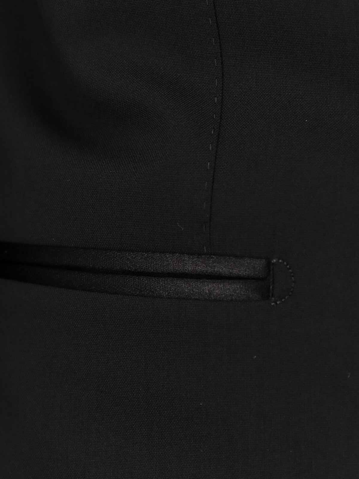 シングルブレストブレザー、シングルカバーボタンクロージャー、サテンピークラペル、フロントにウェルトポケット、ジッパーとメタルフック付きパンツ、ウエストバンド、調節可能なサテンストラップ。