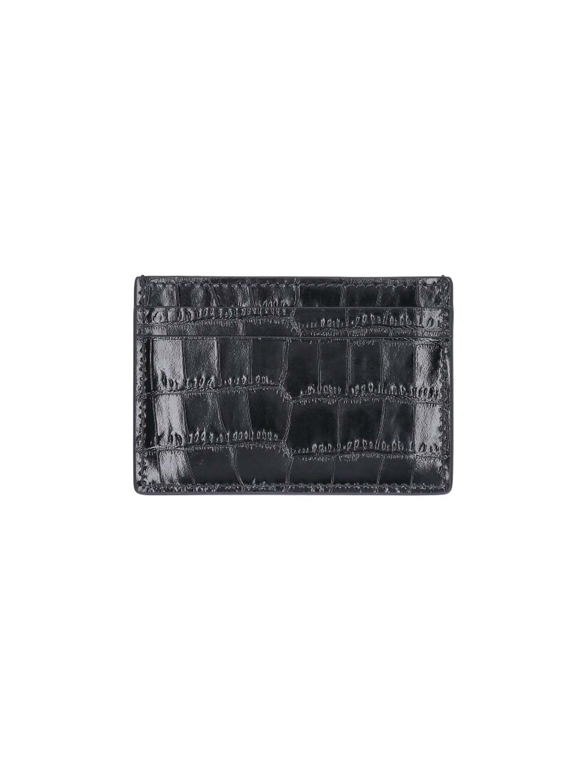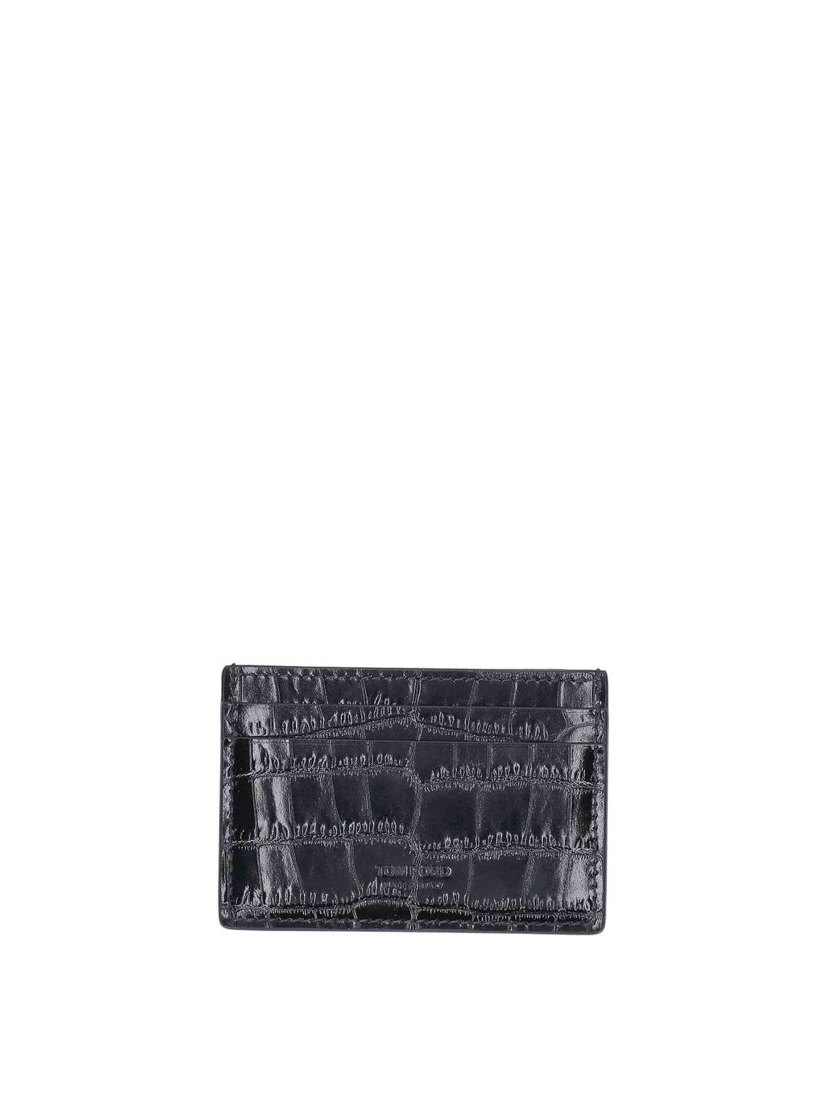 トムフォードプリントレザーカードホルダー、ブラック、クロコダイルエフェクト、前面に金色のエンボス加工ロゴ、中央にフラットポケット1つ、カードスロット4つ。