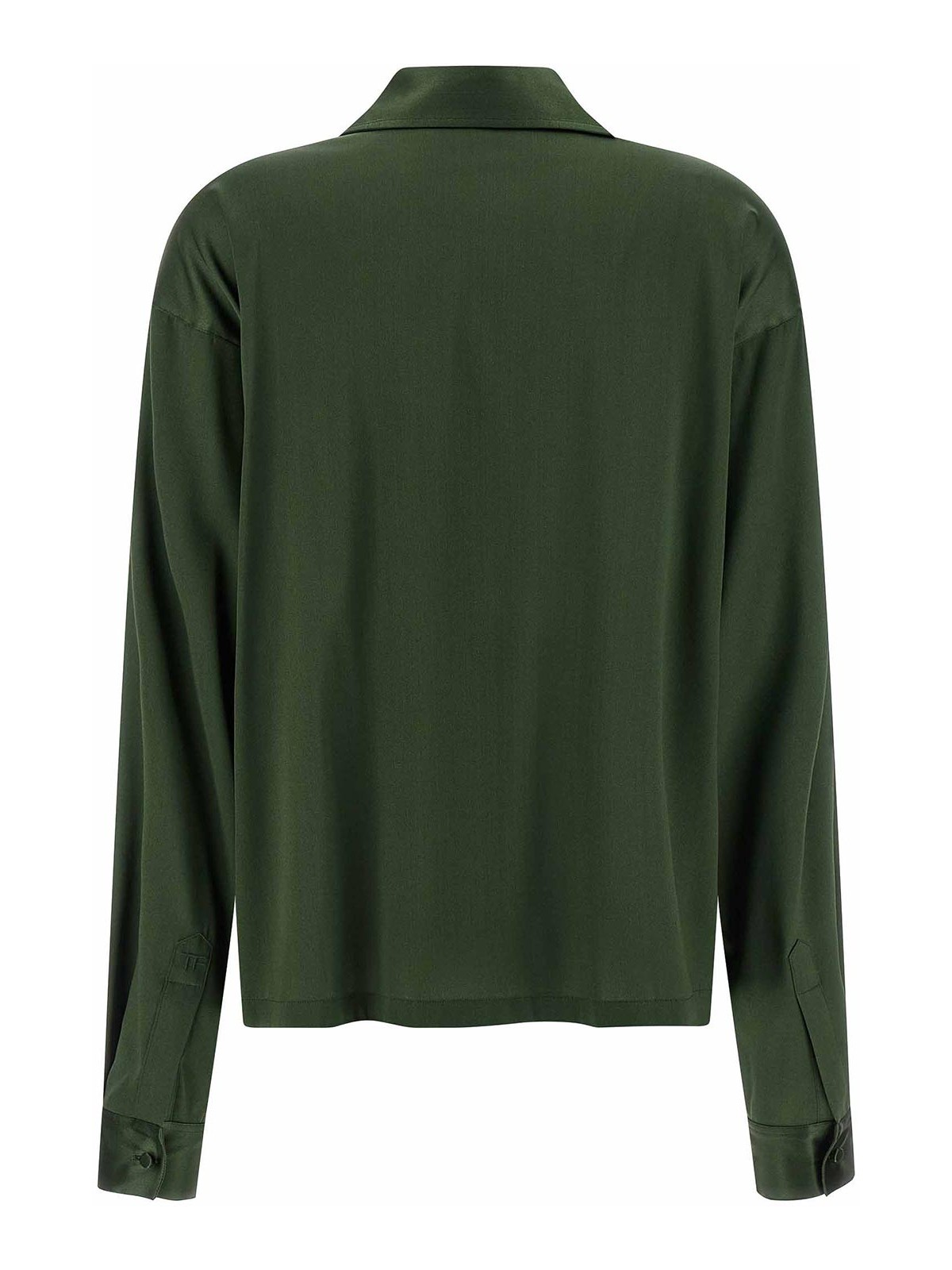 ストレッチシルクサテンのポロシャツ、襟とVネック、袖口とドロップショルダー付きの長袖、サイドスリット。