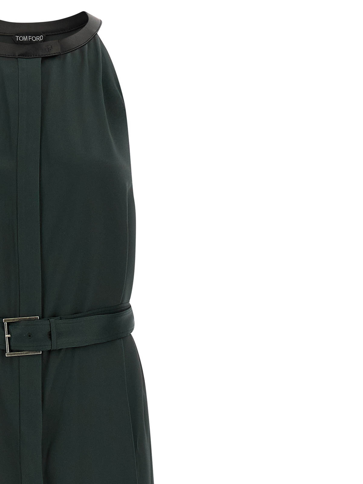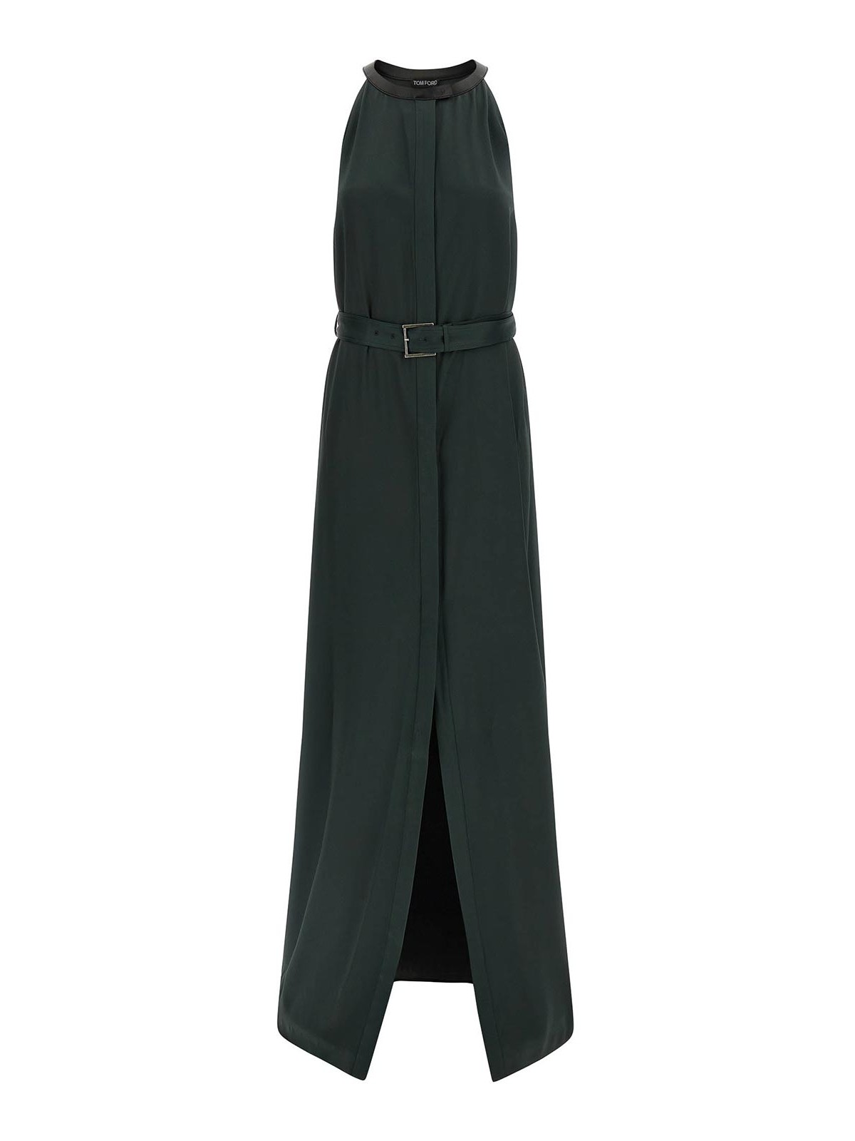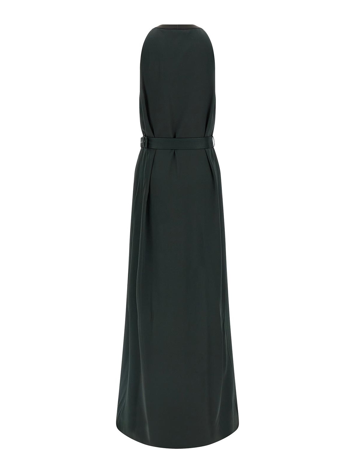 クレープサテンのロングドレス、コントラストカラーのレザーディテールをあしらったアメリカンネックライン、ボタン留め、フロントスプリット、ノースリーブ、取り外し可能なベルト。