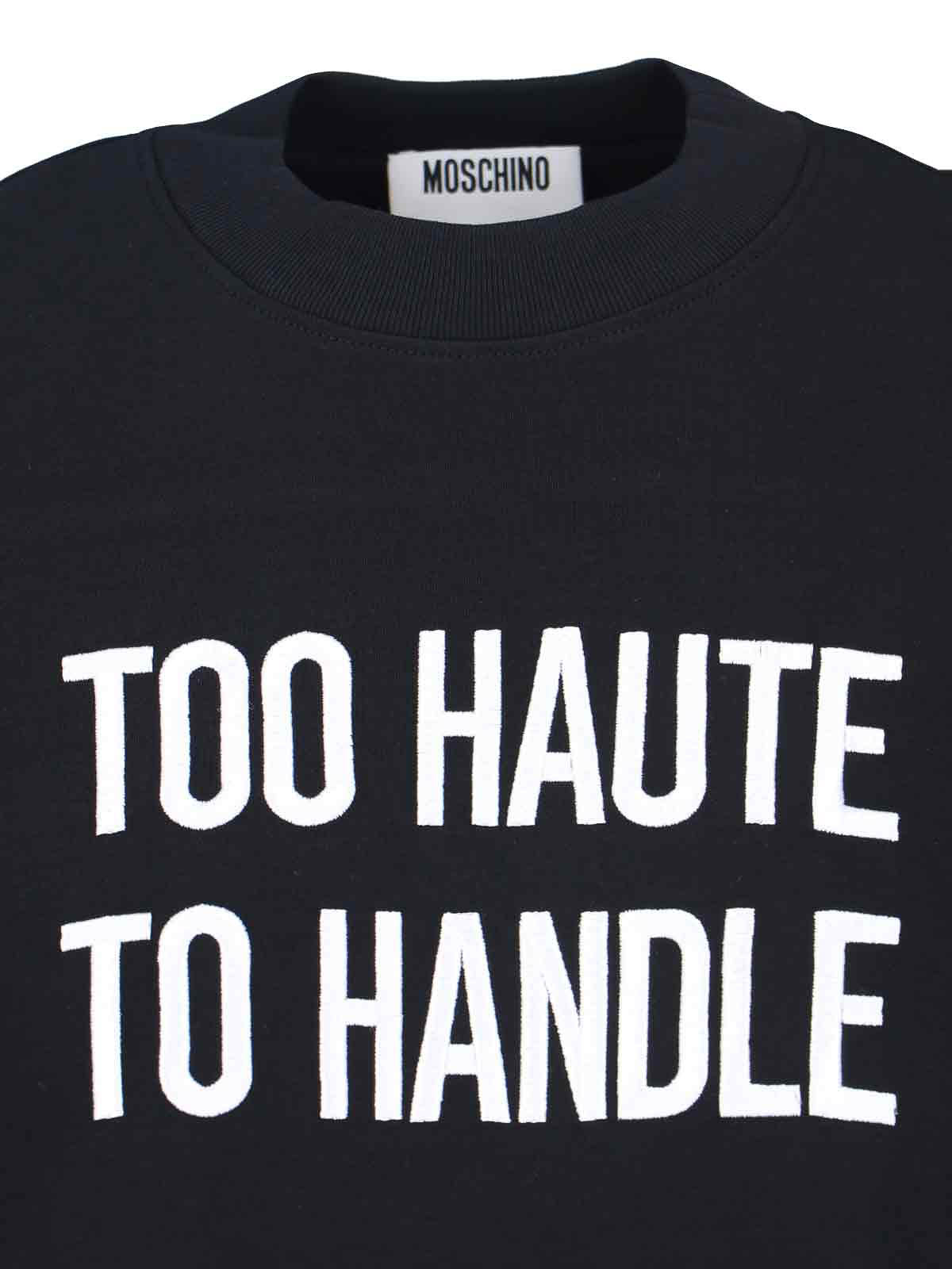 モスキーノは扱いにくいミディドレス。ブラックコットン、クルーネック、ドロップショルダー、半袖、前面にマキシコントラストの効いたロゴ刺繍、背面にロゴ刺繍、ストレートヘム。