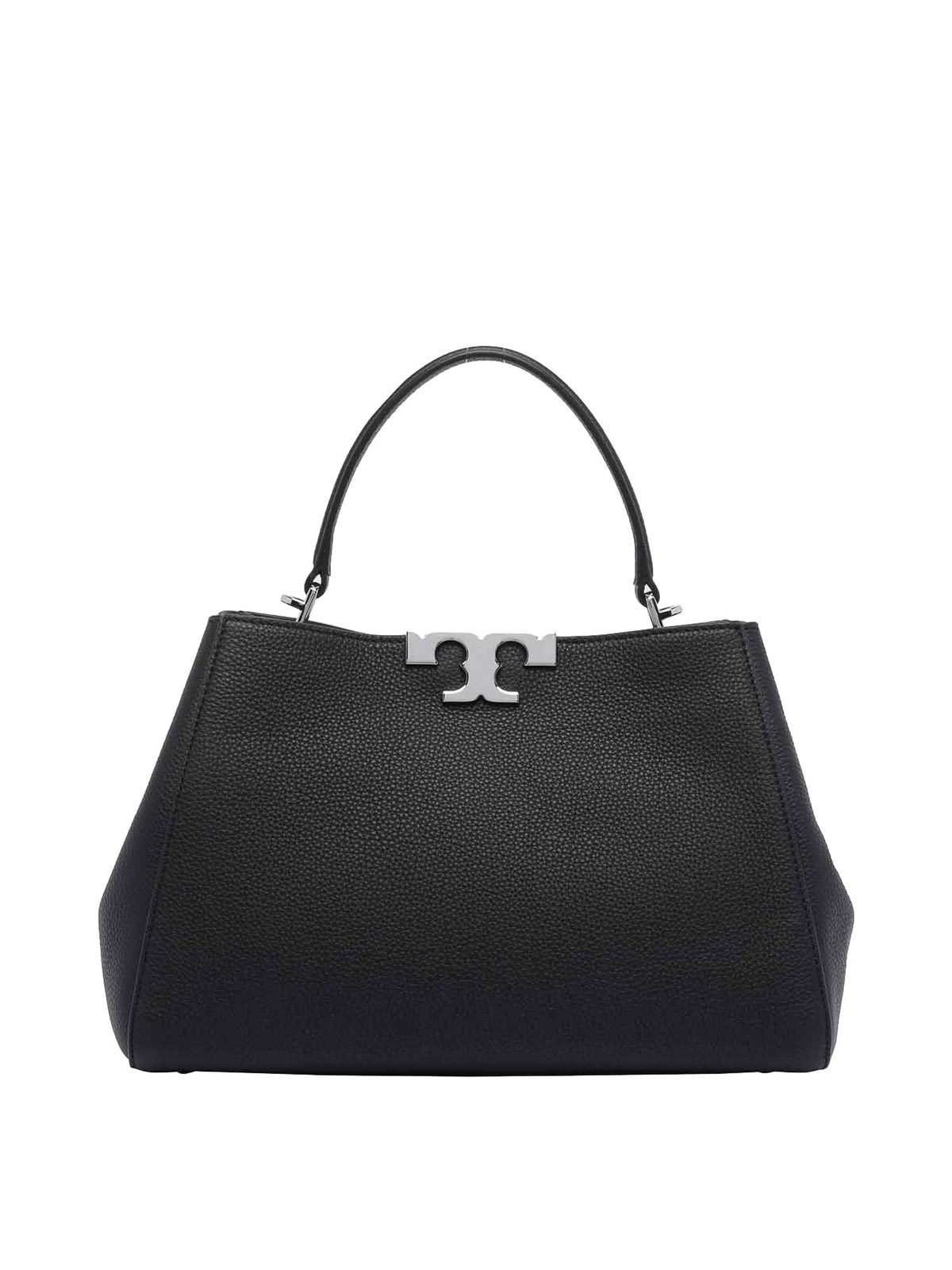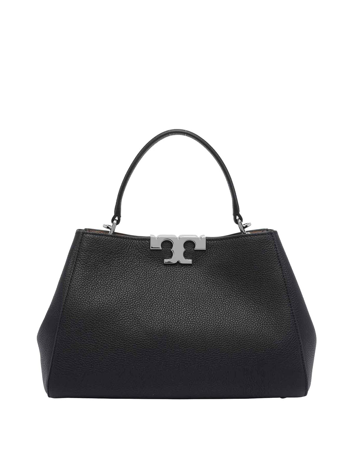 Tory Burch ブラックエレノアペブルドミディアムサッチェルバッグマグネットセクション中央ポケットクリップ付き調節可能で取り外し可能なストラップ正面ロゴデザイナーカラー名:ブラック