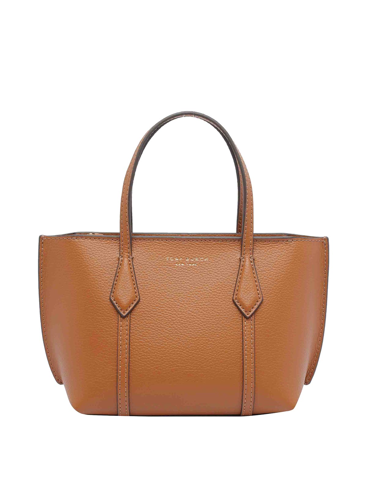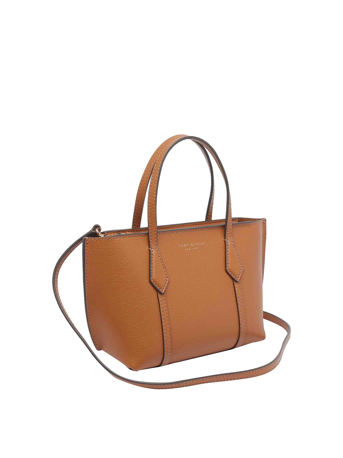 Tory Burch ブラウンミニペリートートバッグファスナー付きオープンポケットショルダーストラップ調節可能取り外し可能なストラップ正面ミニロゴモデルデザイナーカラー名:ブラウン