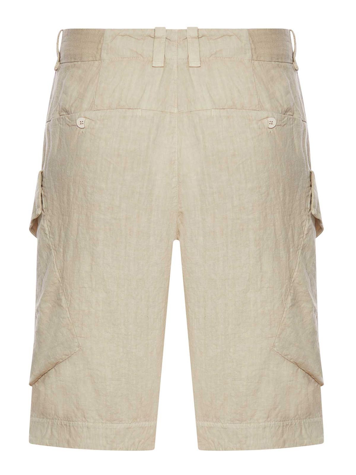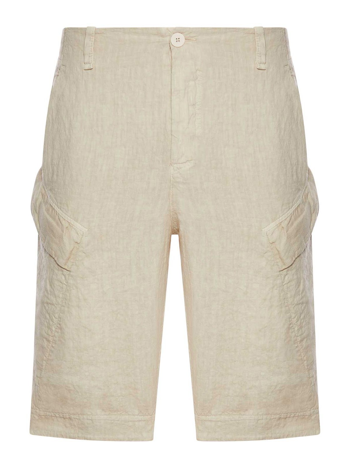 レギュラーフィット、エタミン付きリネン、スラッシュポケット、ボタン付きバックウェルトポケット、フラップ付きラージサイドポケット、バックウエストゴム入り、ファイバーボタン付きボタン付き開口部、カラーストーン