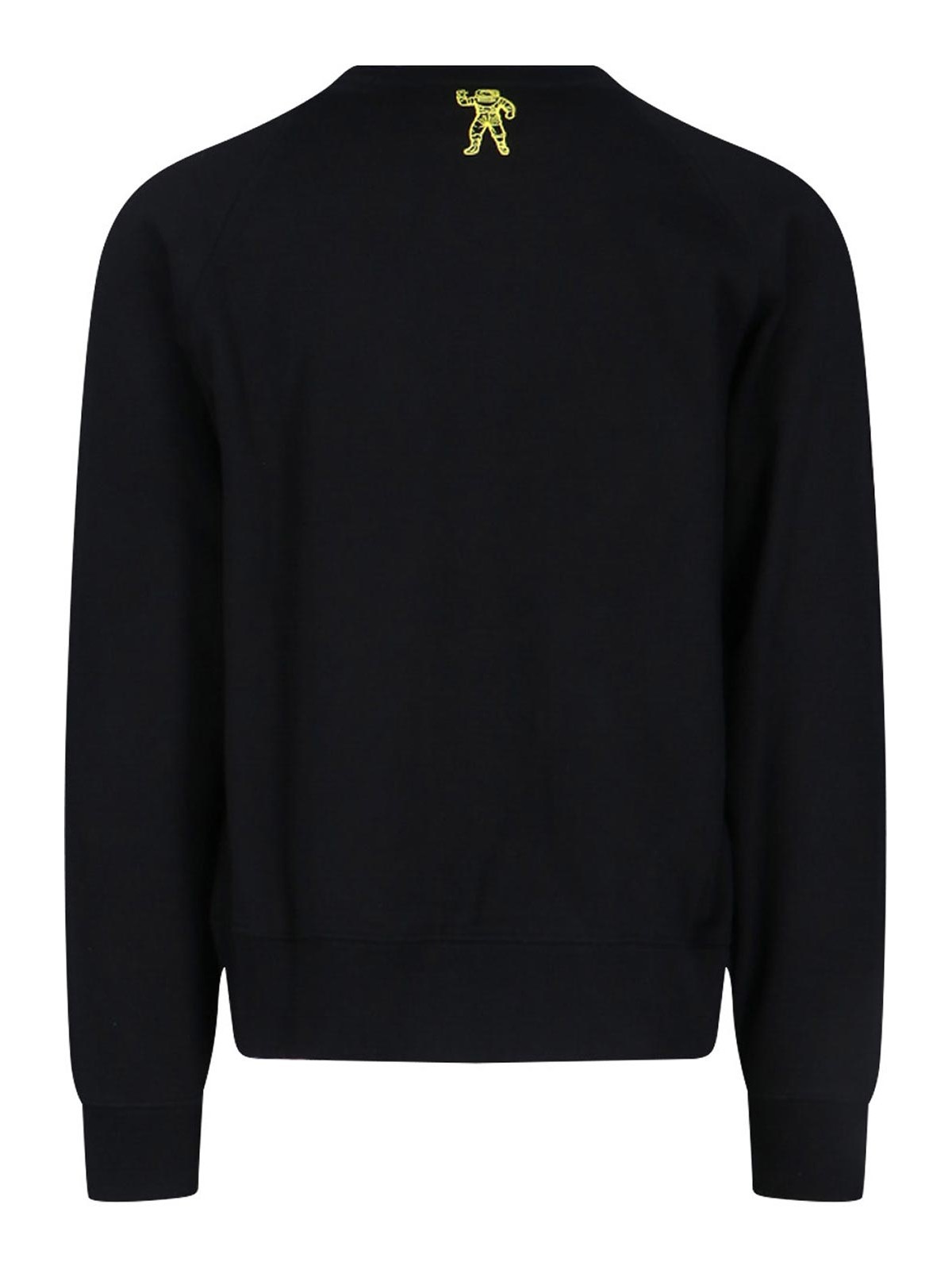 トライトーンのビリオネアボーイズクラブセーター、ブラックコットン、リブ編みのクルーネック、前面にマキシマルチカラーのロゴプリント、袖にコントラストの効いたロゴラベル、背面に黄色のロゴプリント、リブ編みの仕上げ、ストレートヘム。