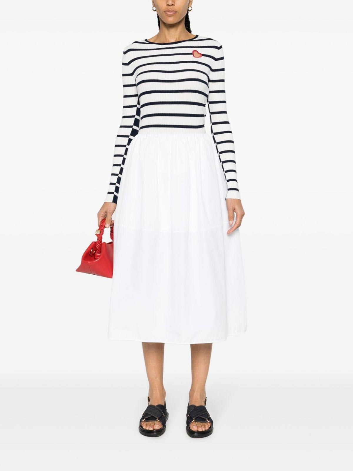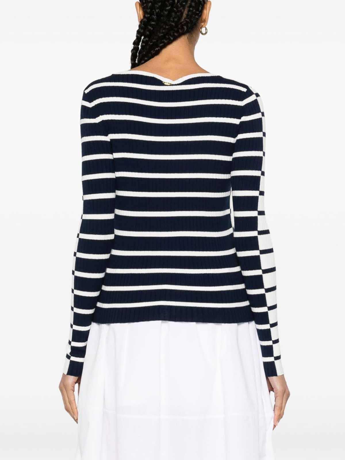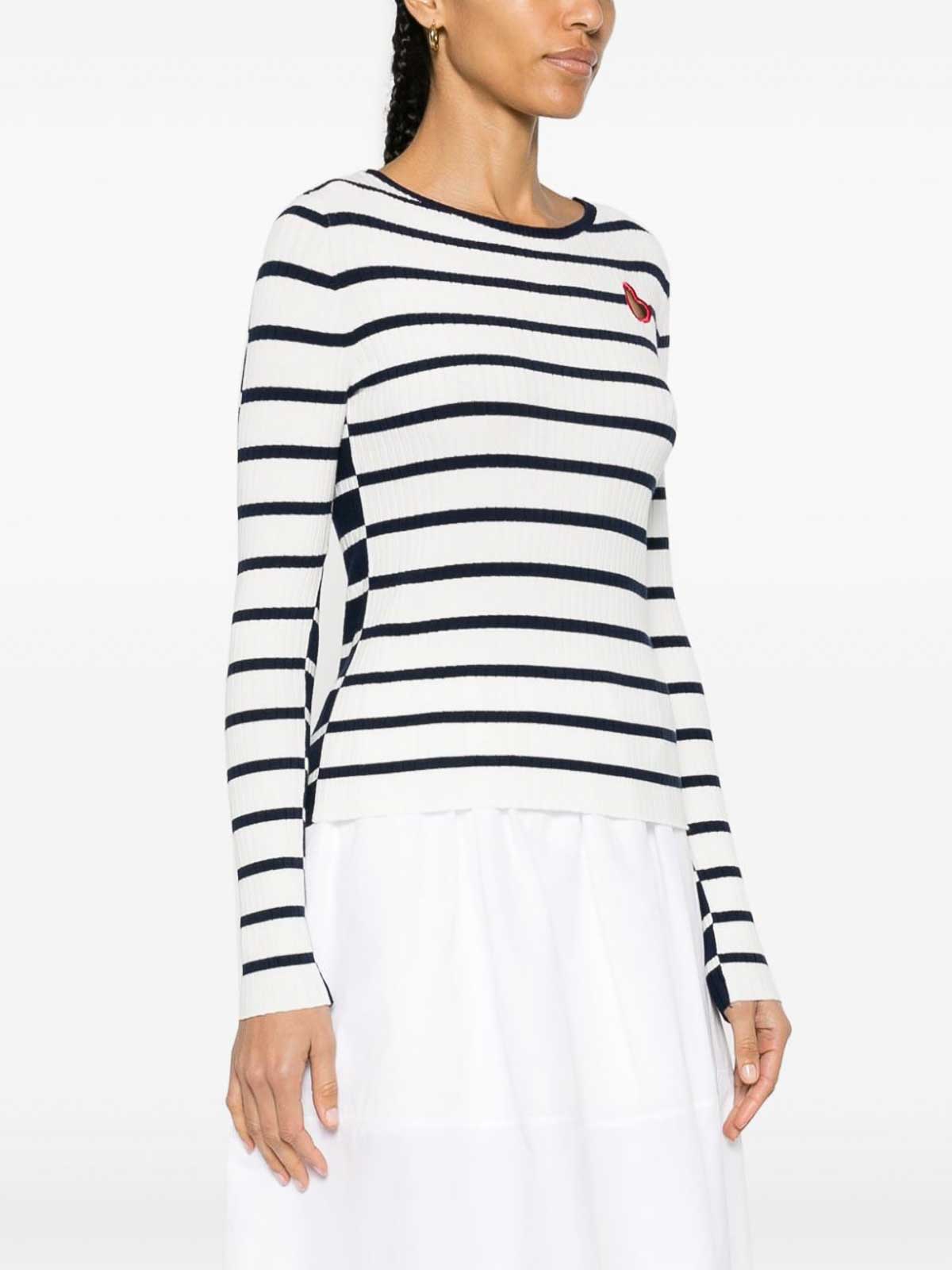 ストライプセーター、白と青、リブ編み、ホリゾンタルライン、コントラストパネル、コントラストカラーのクルーネック、刺繍入りカットアウト S、ロングスリーブ、背面にロゴプレート、ストレートヘム、プルオンスタイル