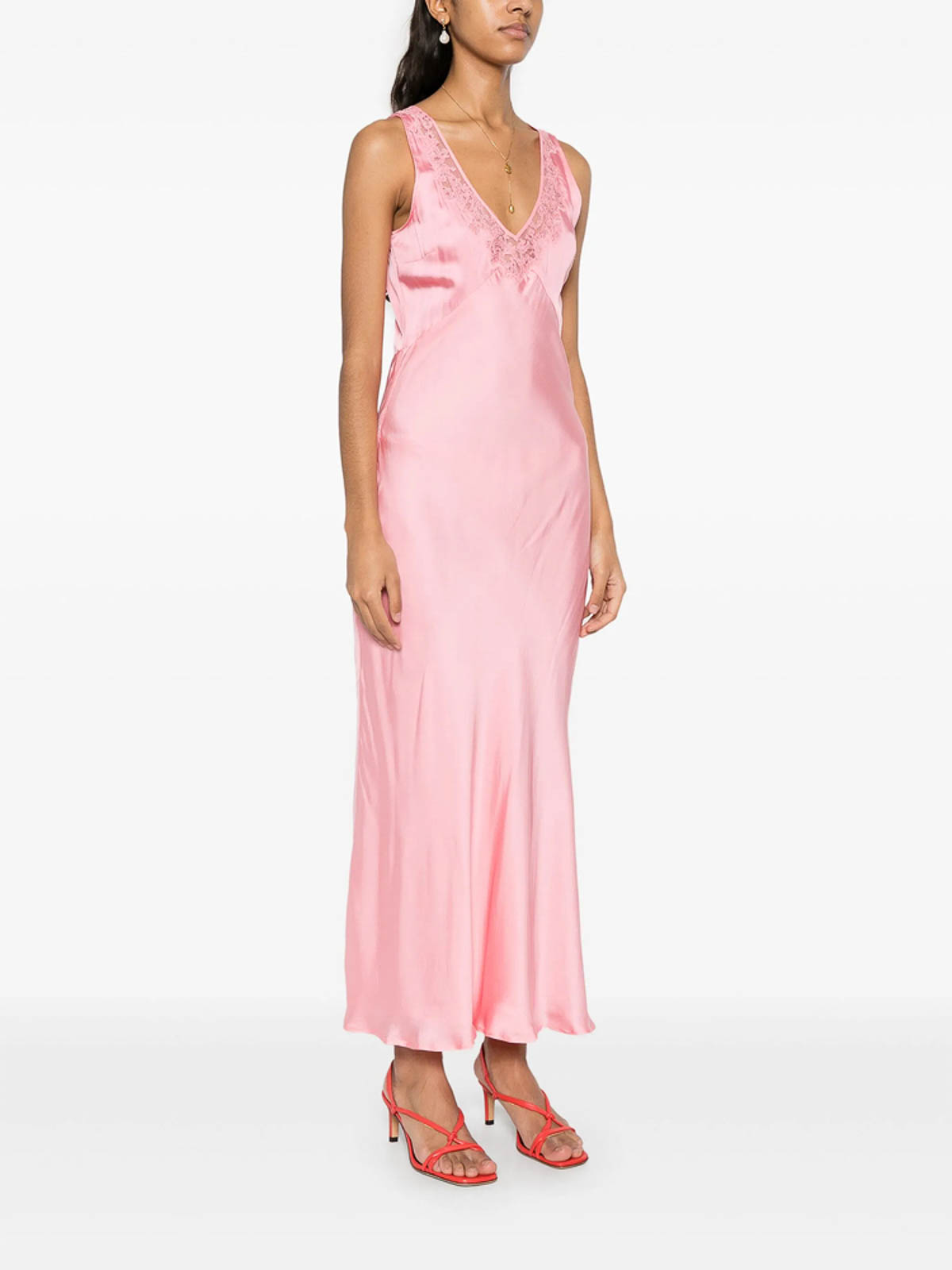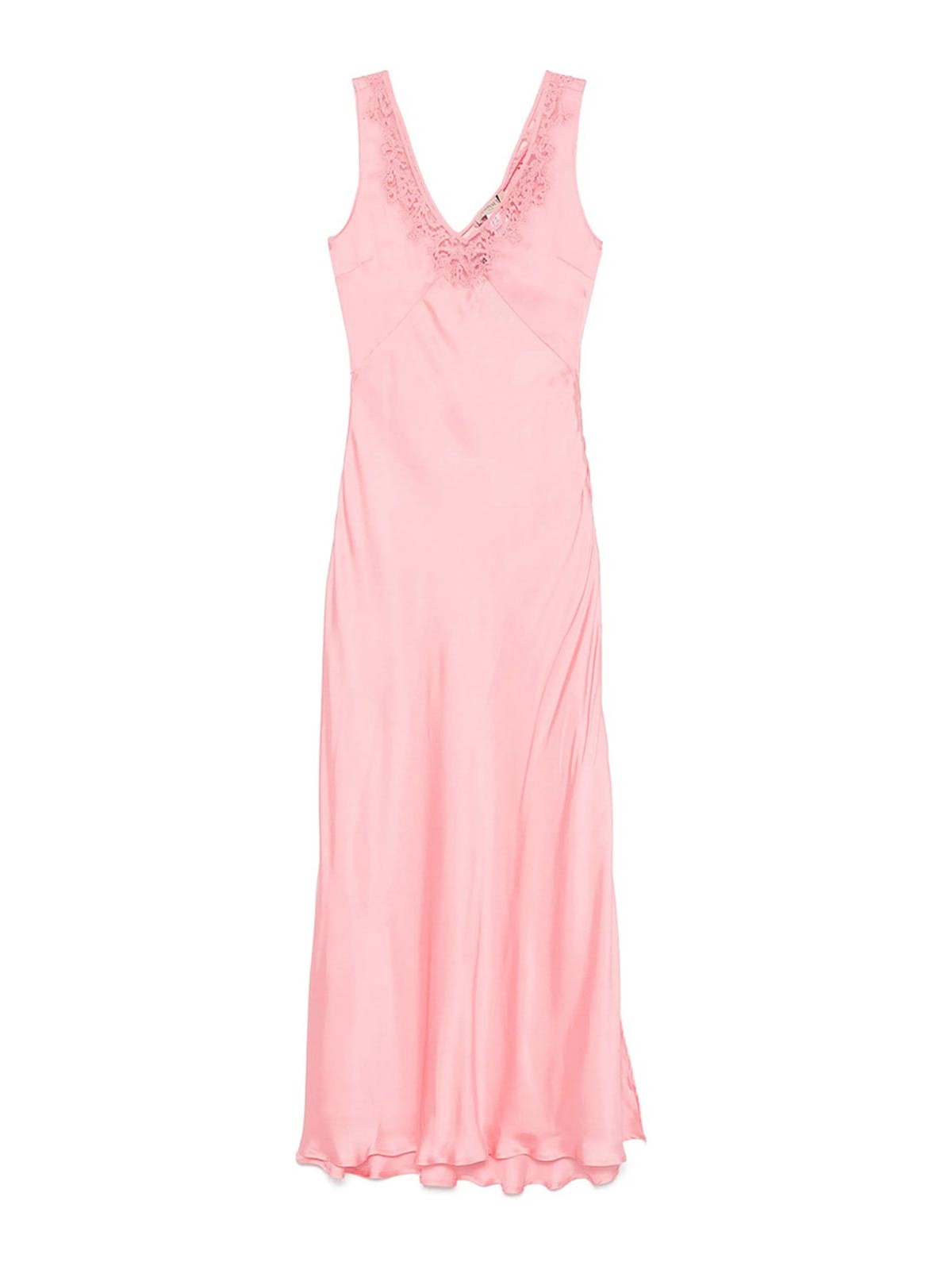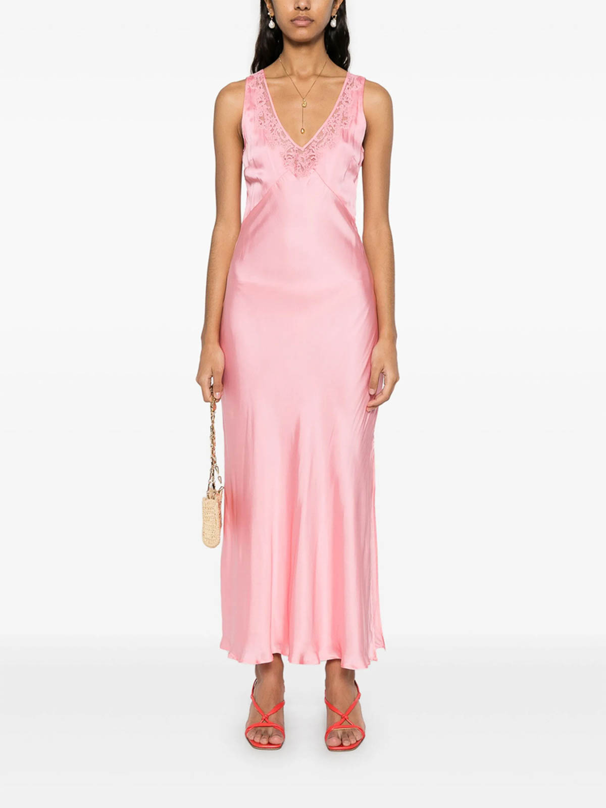 フラミンゴピンクの隠しサイドフックとジッパーレースパネル Vネック Vバック