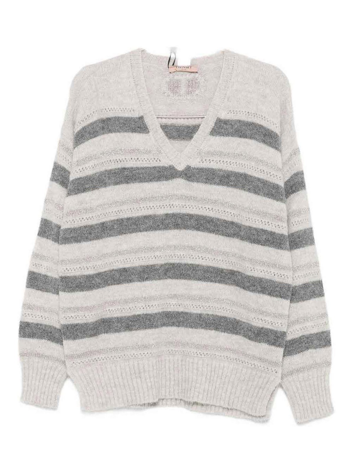 グレーのVネックストライプ柄ロングスリーブリブ付きヘム