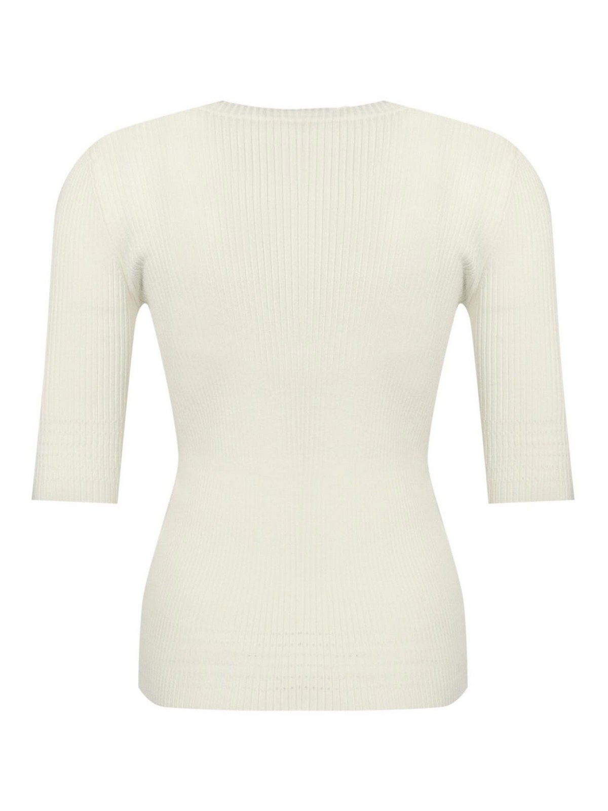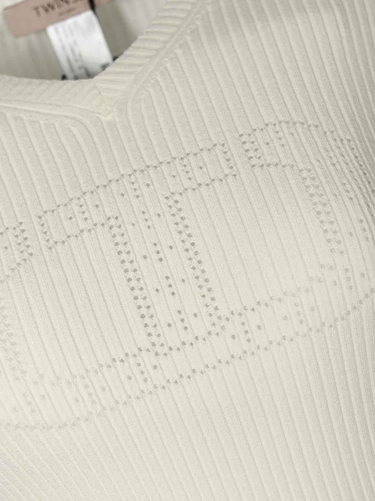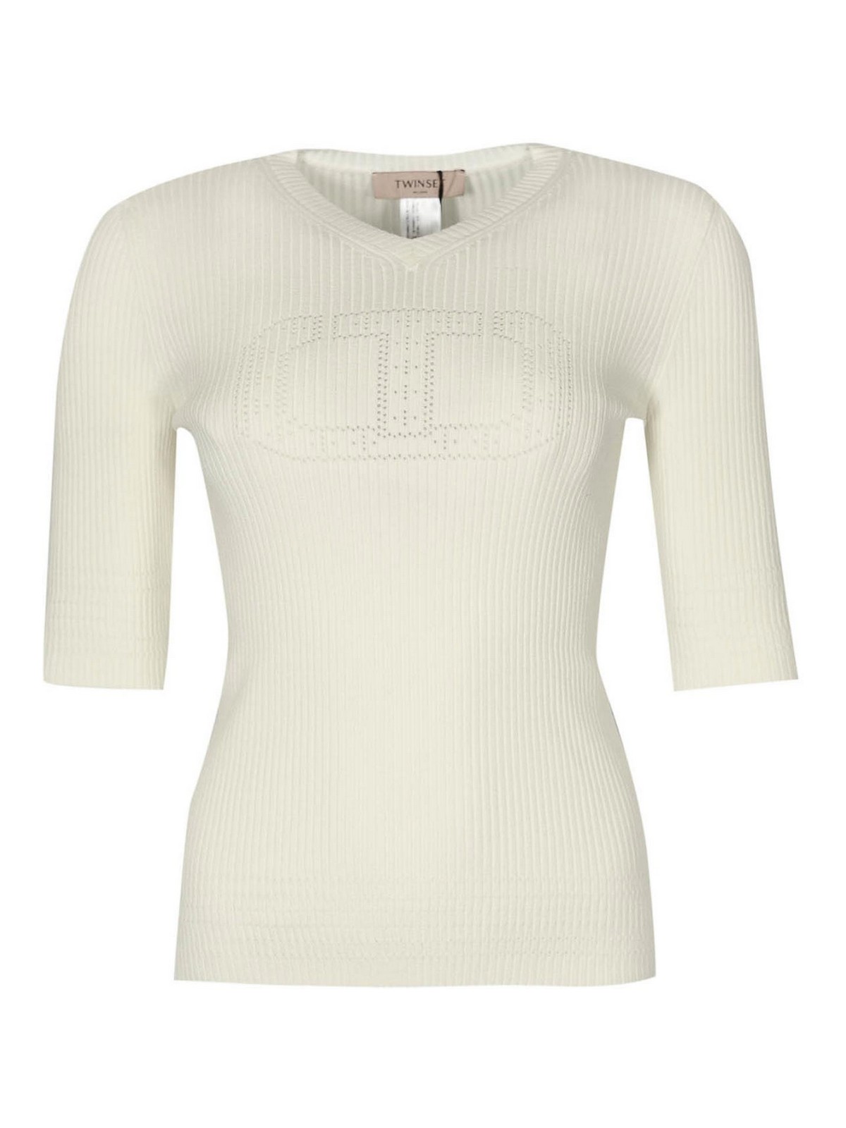ビスコースニット、リブ編み、袖はわずかにV、首回りは楕円形、Tロゴ、穴の開いたストレートヘム、スリムフィット