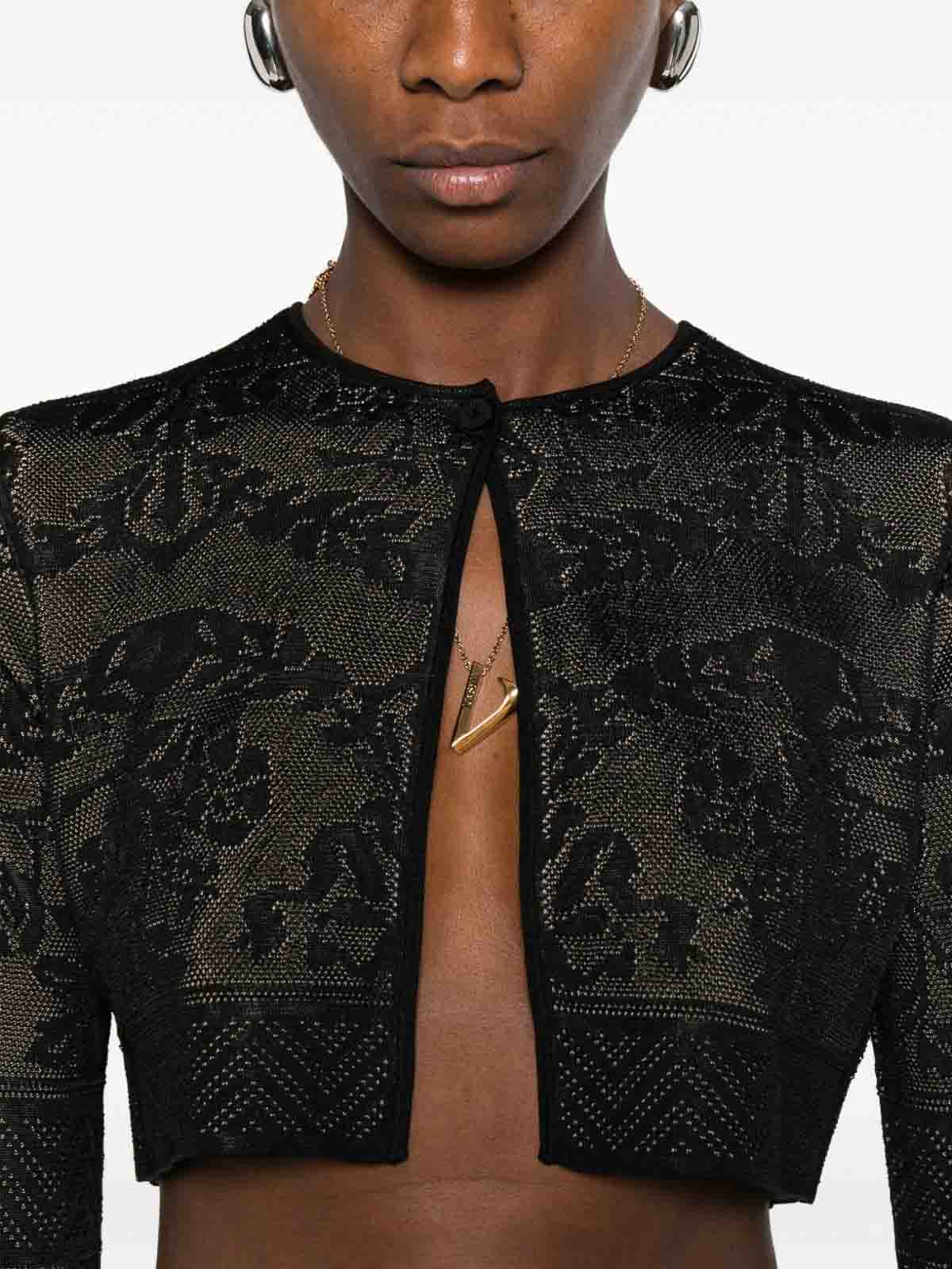 ブラック花柄長袖クロップデザインクルーネック、ボタン付き