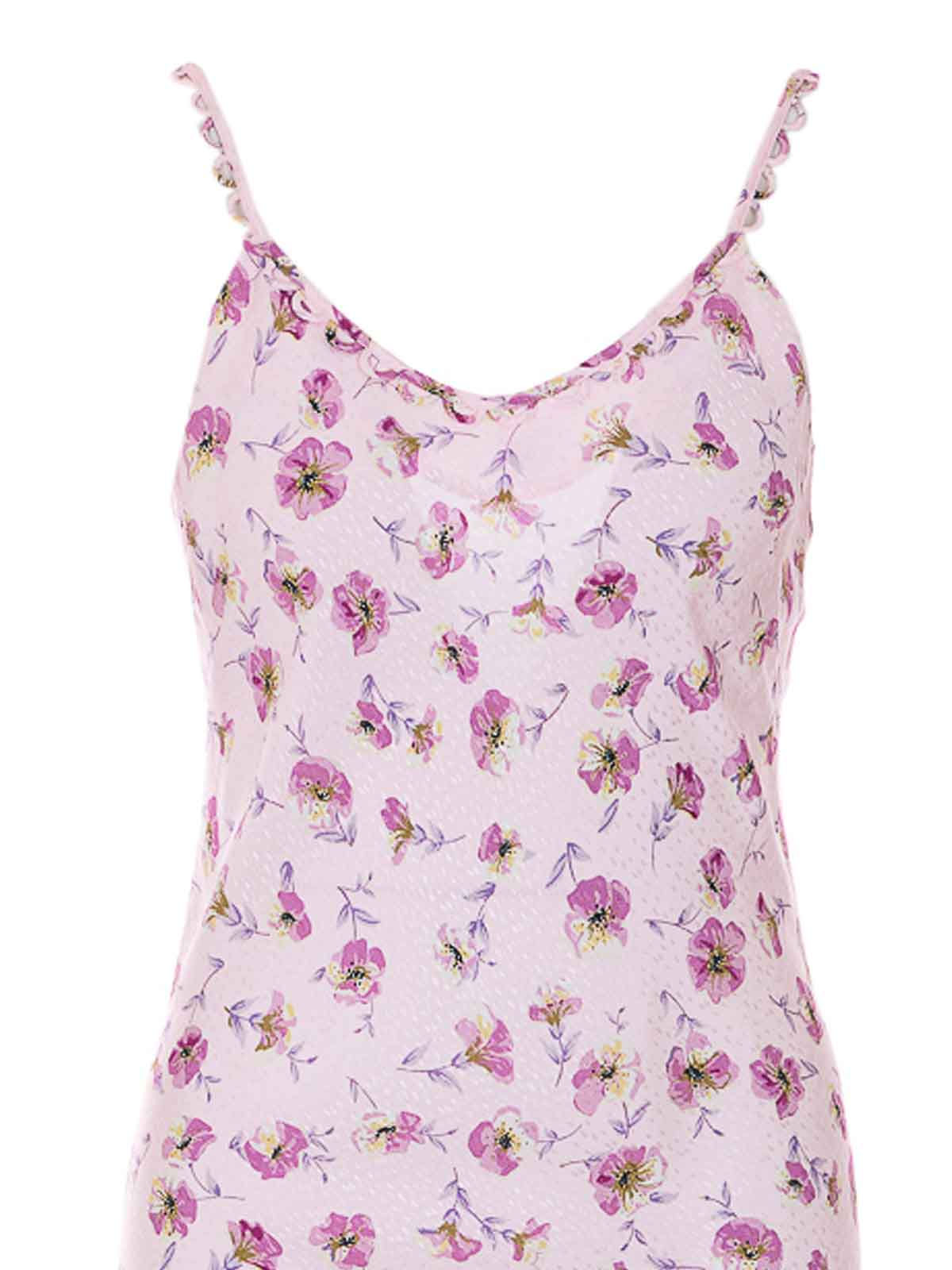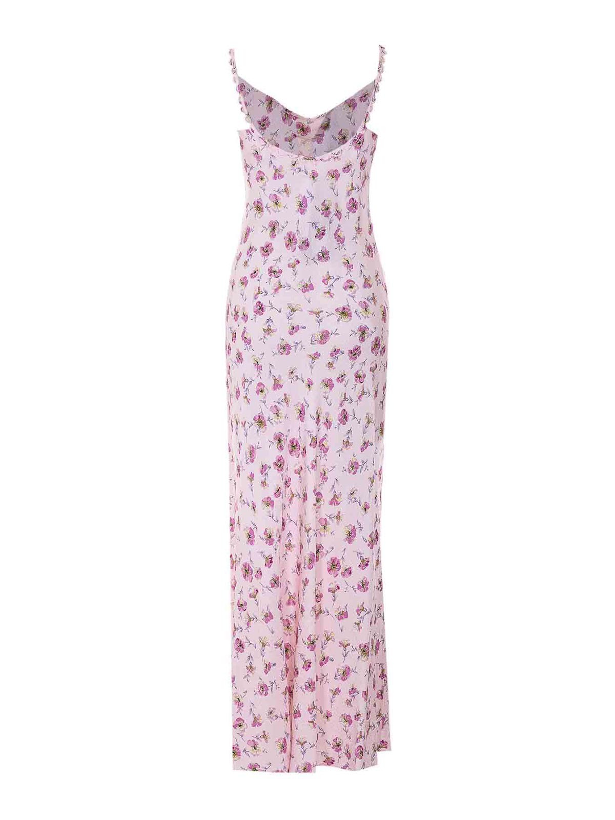 ツインセットピンクドレス、花柄、細いショルダーストラップ、ロングモデル