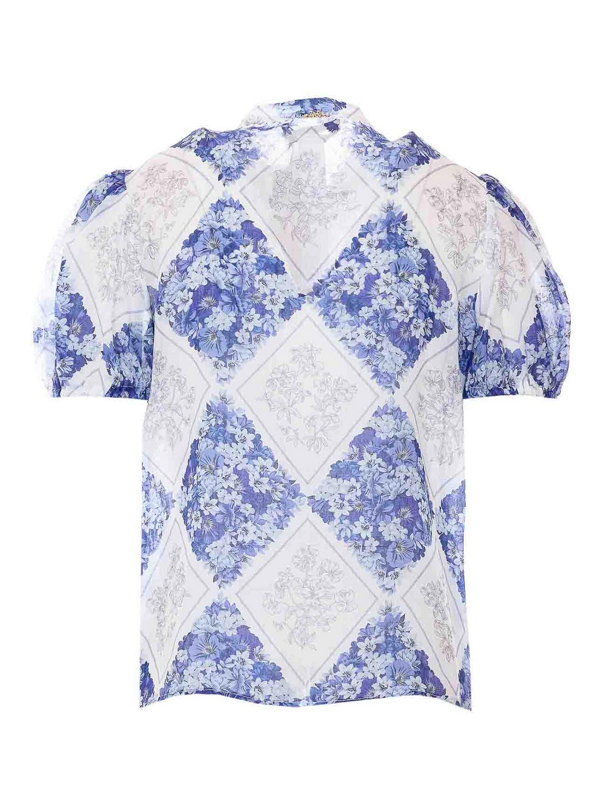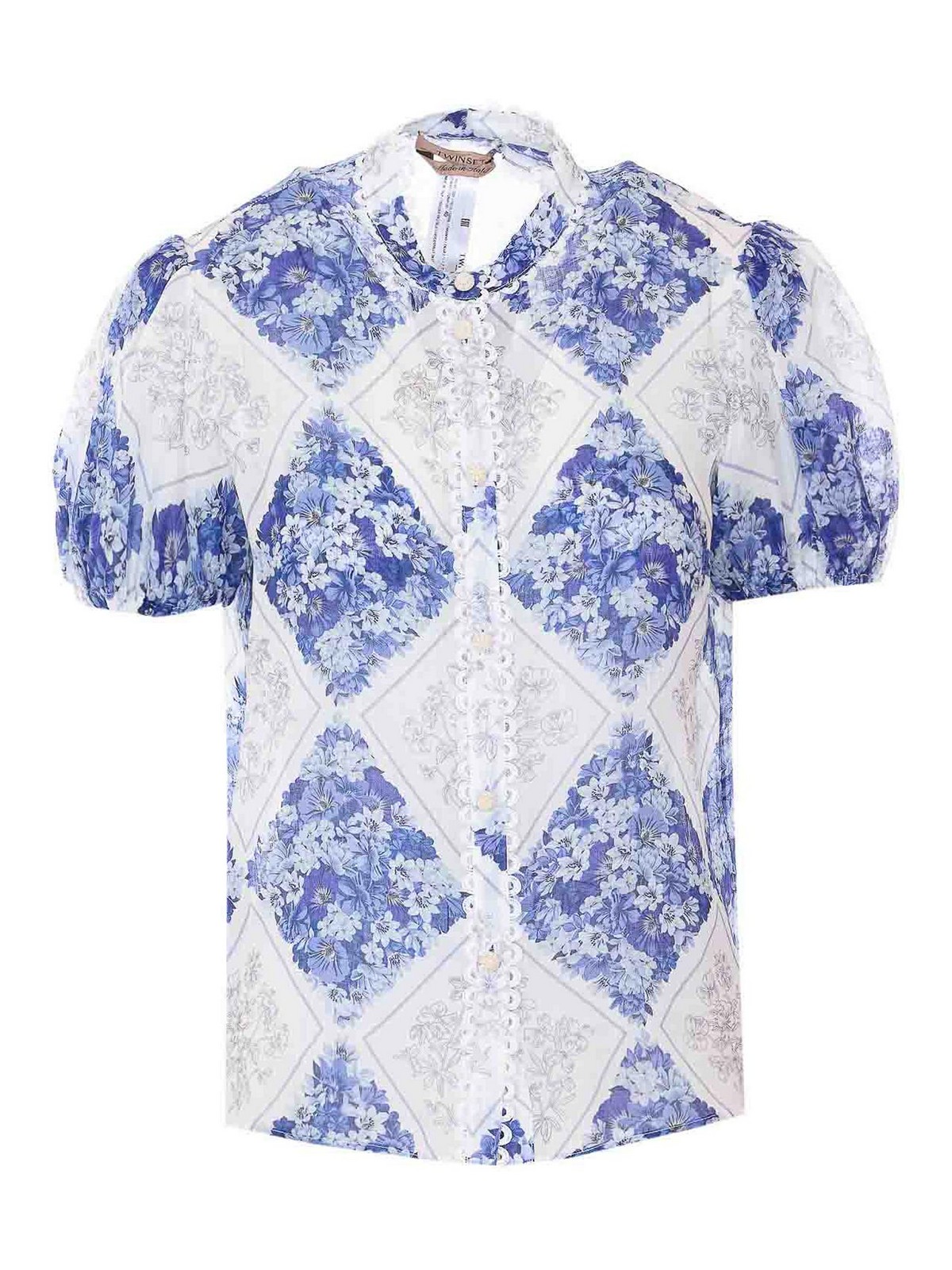 Twinset 白と青のボタン留め付きシャツ、クルーネック、半袖、花柄プリント