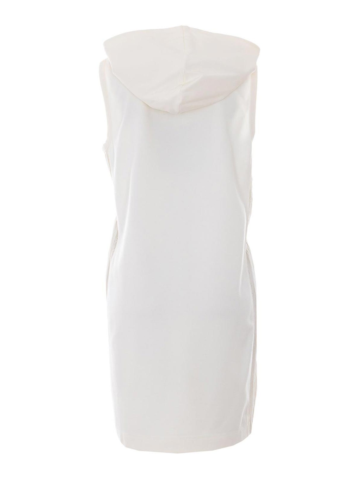ツインセットホワイトドレス、フード付き、ノースリーブ、ラテラルプリーツエフェクト、レースディテール