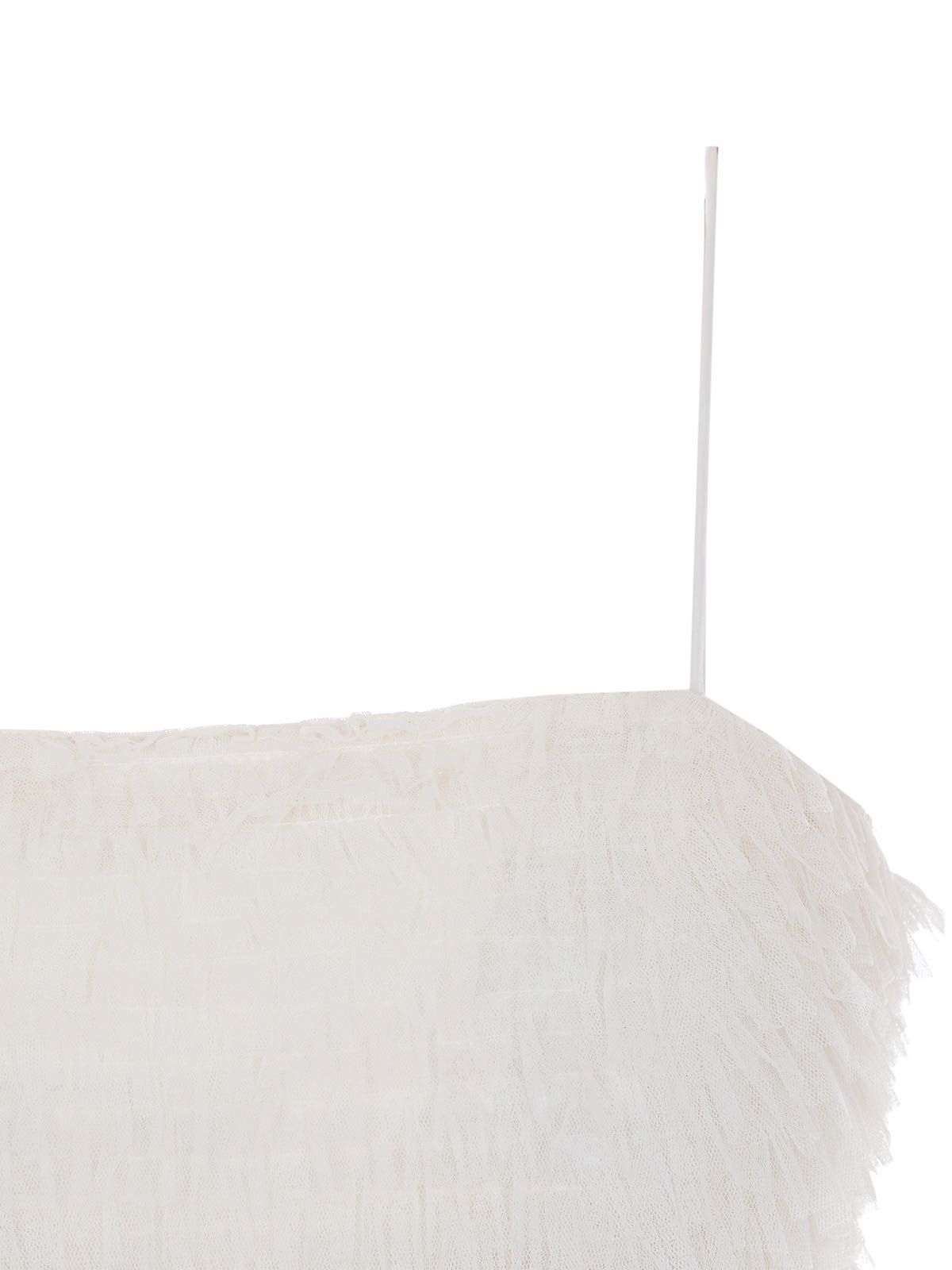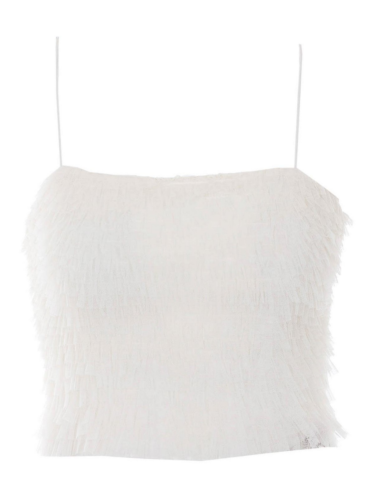 ツインセットホワイトチュールトップ、ボートネック、細いショルダーストラップ、横ファスナー、クロップモデル、背面にロゴ