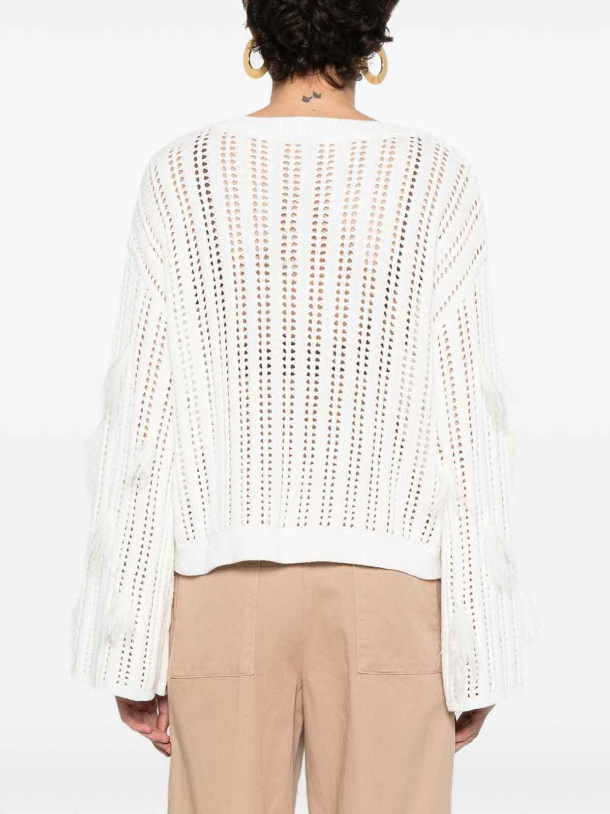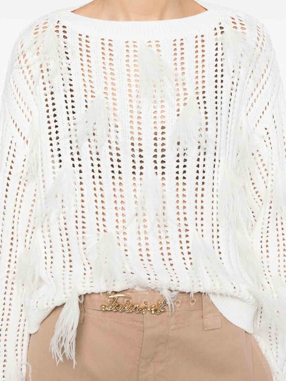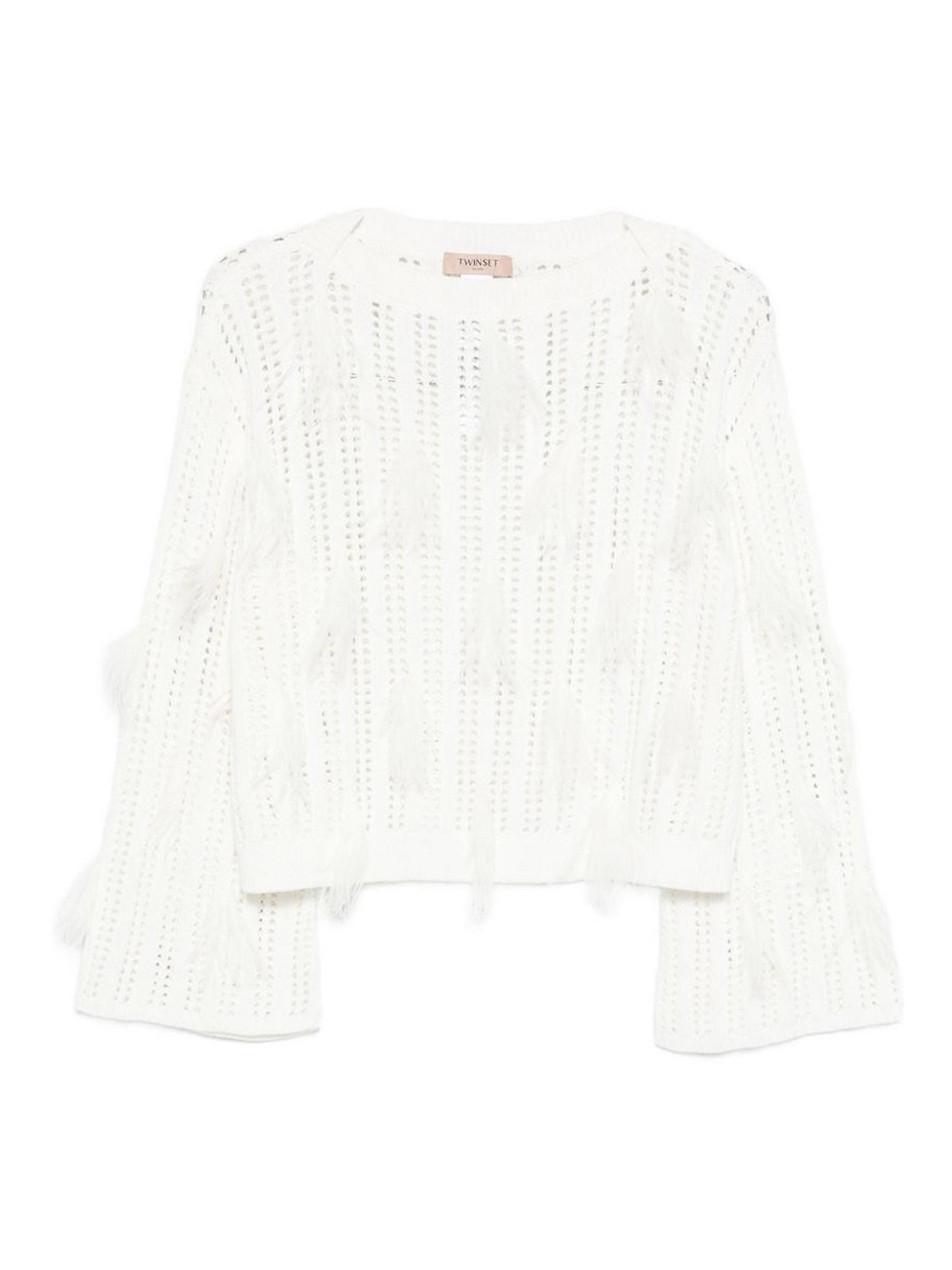 twinsetの白いコットン混紡オープンニット生地のジャンパーは、フレアのロングスリーブと端のフェザーのディテールが動きと女性らしさを添えています。少しリラックスしたフィット感とオリジナルデザインは、シックな日常のルックス、洗練された昼間の服装、またはTwinsetのスカートやズボンとのスタイリングに最適です。現代的なスタイル、軽さ、洗練さを組み合わせた独特の作品です。