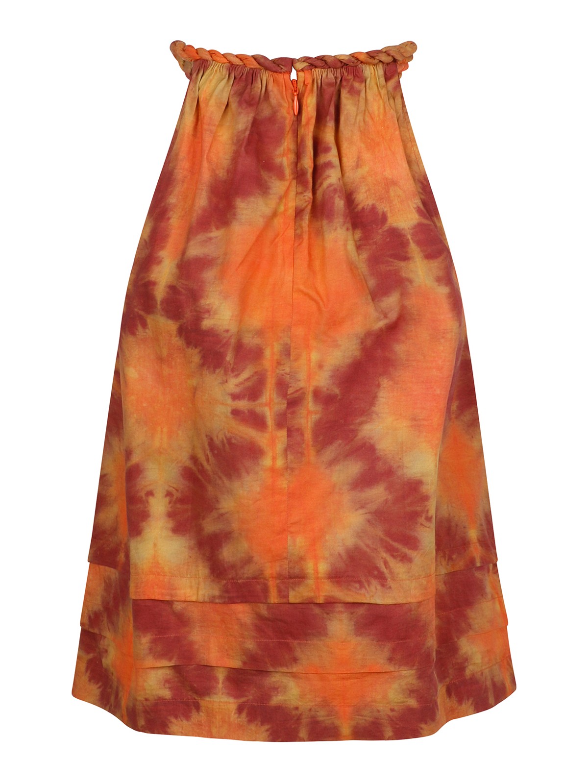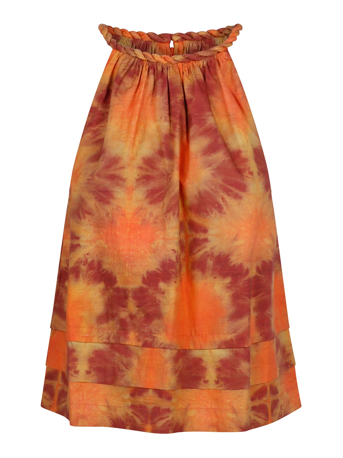 Ulla Johnsonによる絞り染め模様のトップ、絞り染めプリント、ウーブンディテール、ノースリーブ、フリル付きヘム、背中に隠しファスナー付き。