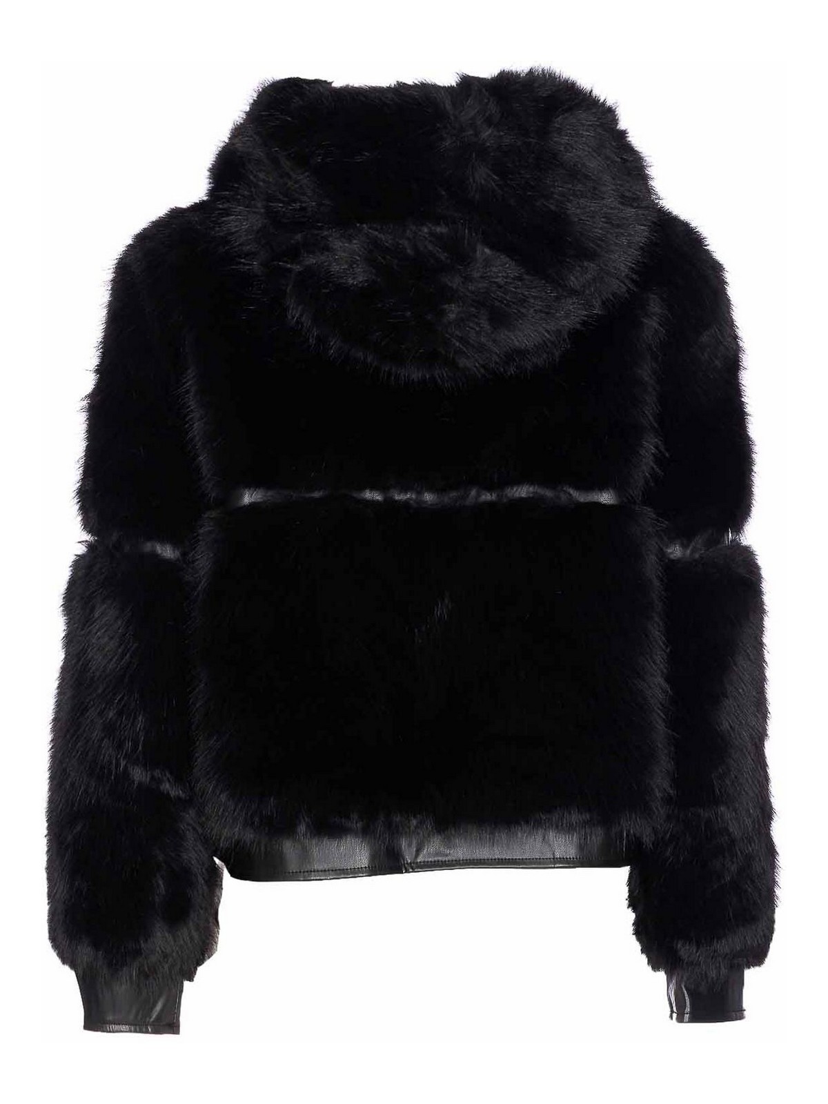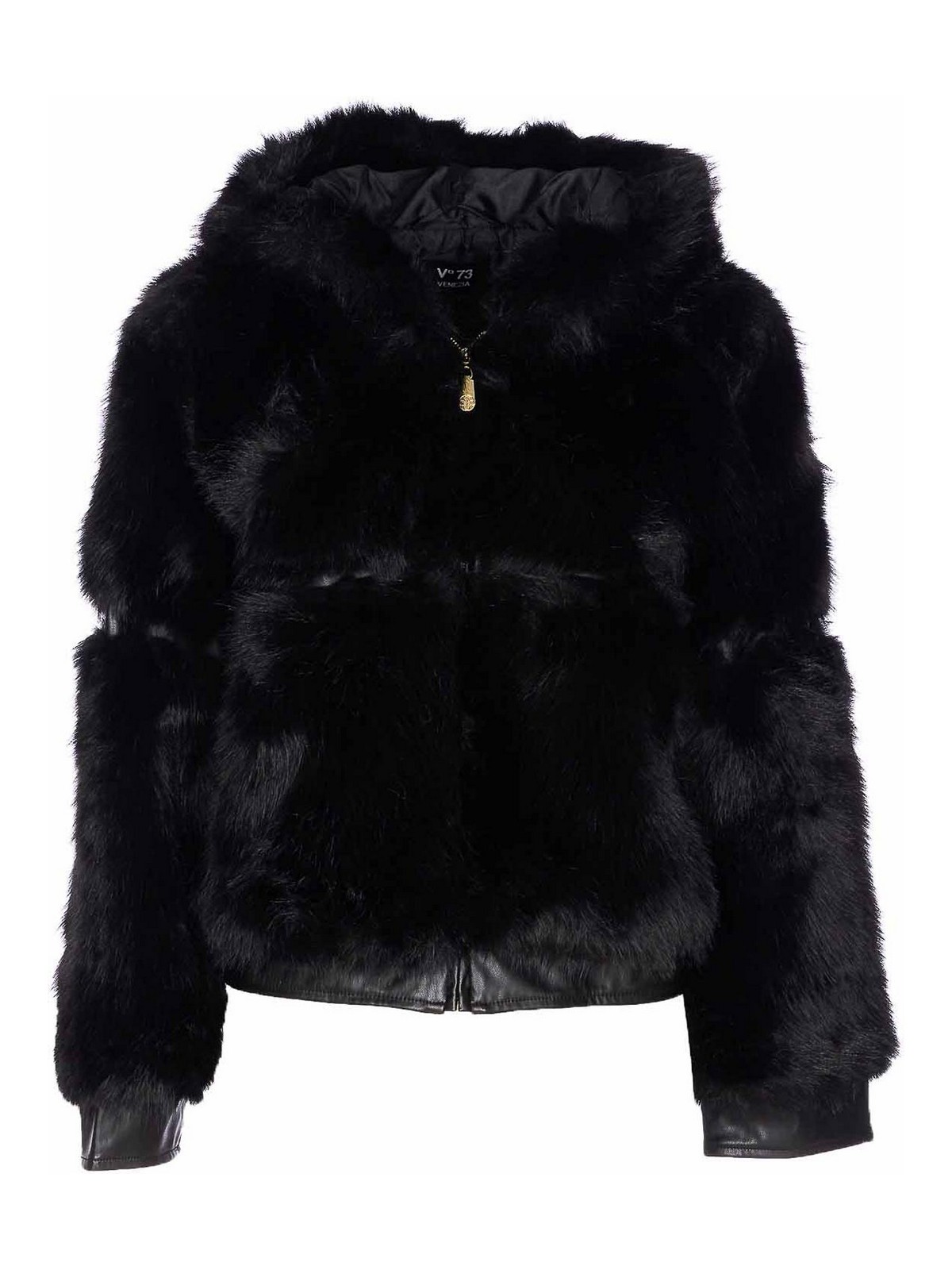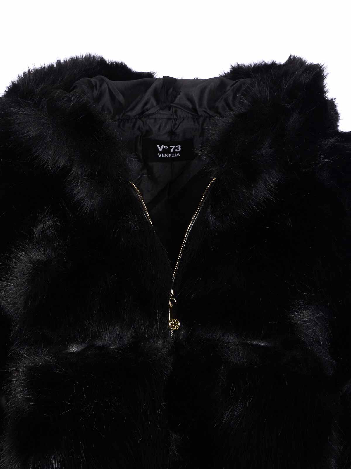 V73 ブラックペニーフェイクファージャケット、フロントファスナー、ポケット、フードディテール付き