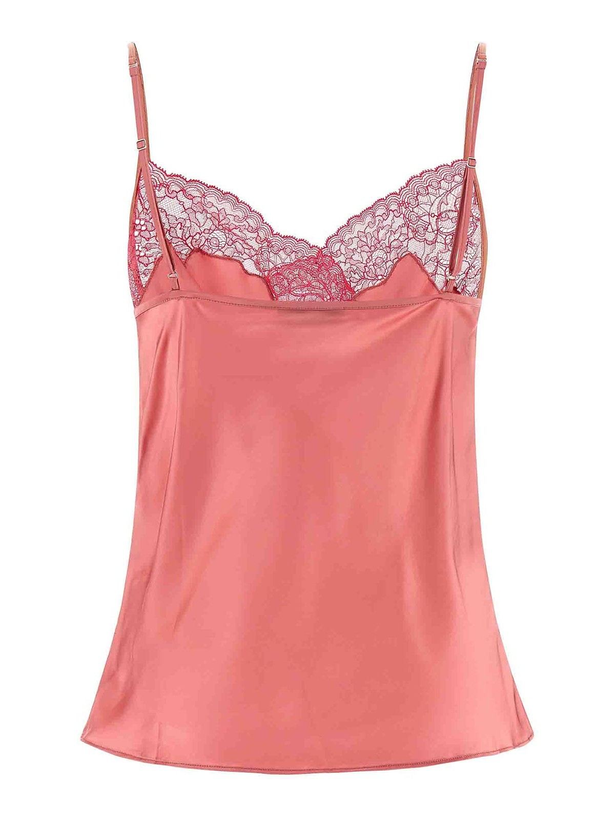 シグネチャーレースのやや伸縮性のあるビンテージ風サテントップ、ネックラインにアシンメトリーなレースインサート、「ランジェリー」にインスパイアされたモデル、調節可能な細いストラップ、フロントカール。
