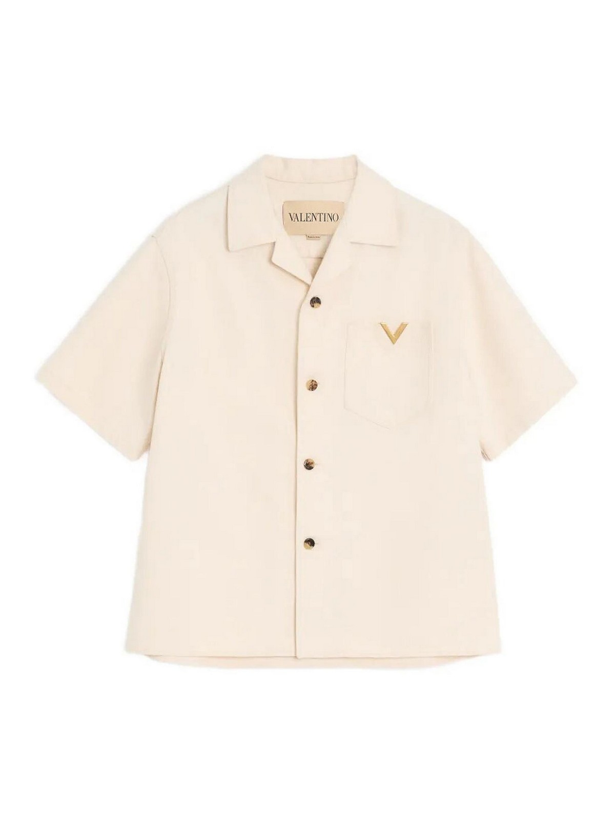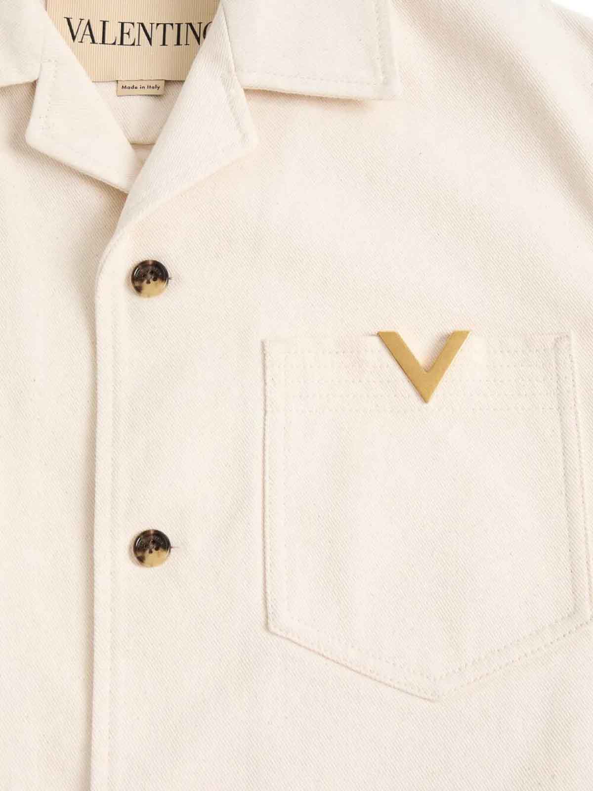 メンズ用半袖デニムシャツ。アイコニックなアクセントとなるVゴールドのディテールで彩りを添えました。アイボリーカラーはクラシックなデニム生地にモダンなタッチを加え、洗練されたカジュアルな装いにぴったりです。