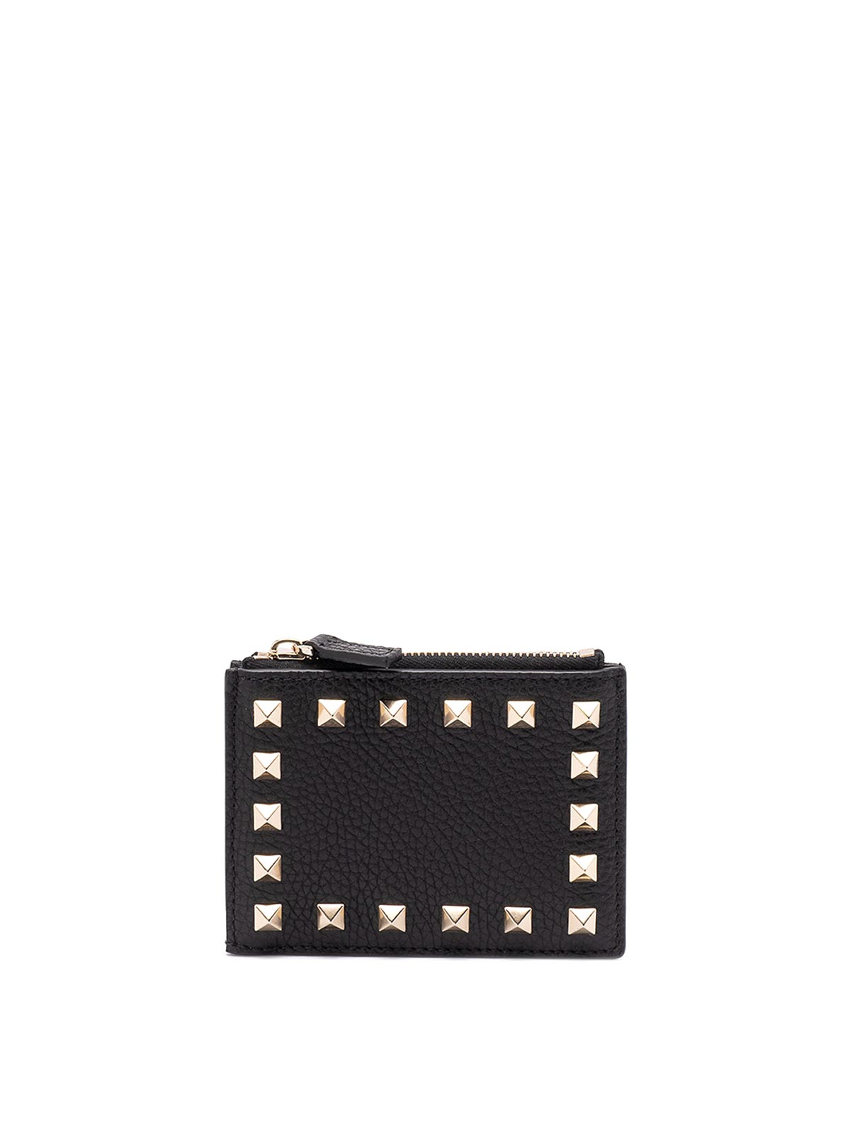 ザラザラしたプラチナのValentino Garavani ロックスタッズコインケースとカードホルダー、仕上げのスタッズ、ファスナー付きの拡張可能な小銭入れ、6つのカードスロットが付いたハードウェア拡張可能なコインコンパートメント