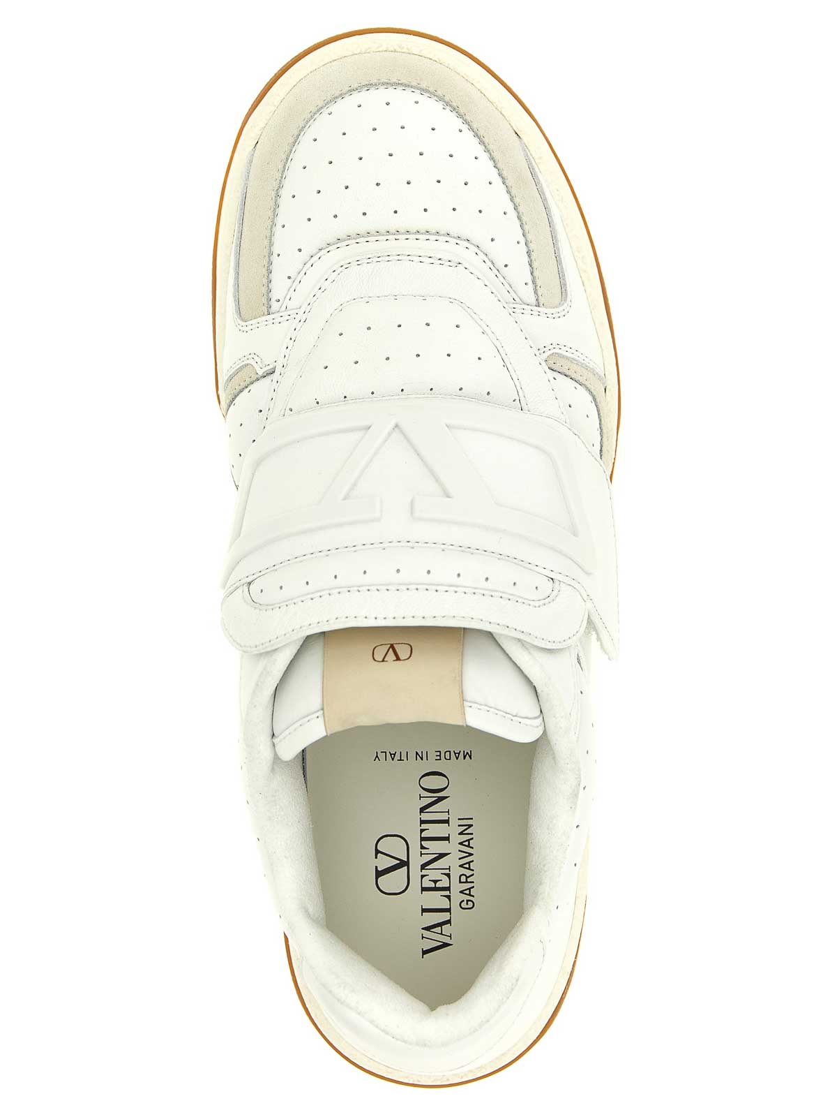 ナッパカーフレザーとスエードで仕立てたジョイ・ド・ジュアーのスニーカー。トーン・オン・トーンのラバー加工のVLOGOシグネチャーディテールをあしらったフック&ループクロージャー、インナーレースアップクロージャー、テクニカルメッシュの裏地、ラバーソール。