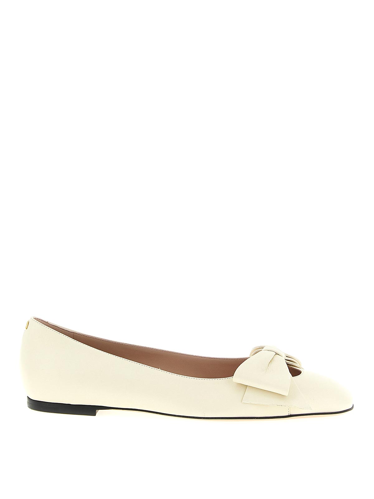 フロントにコントラストリボンのディテールをあしらったボウのキッドスキンバレエシューズ、スクエアトウ、ヒールにVlogoシグネチャーのメタリックアンティーク効果、レザーソール。