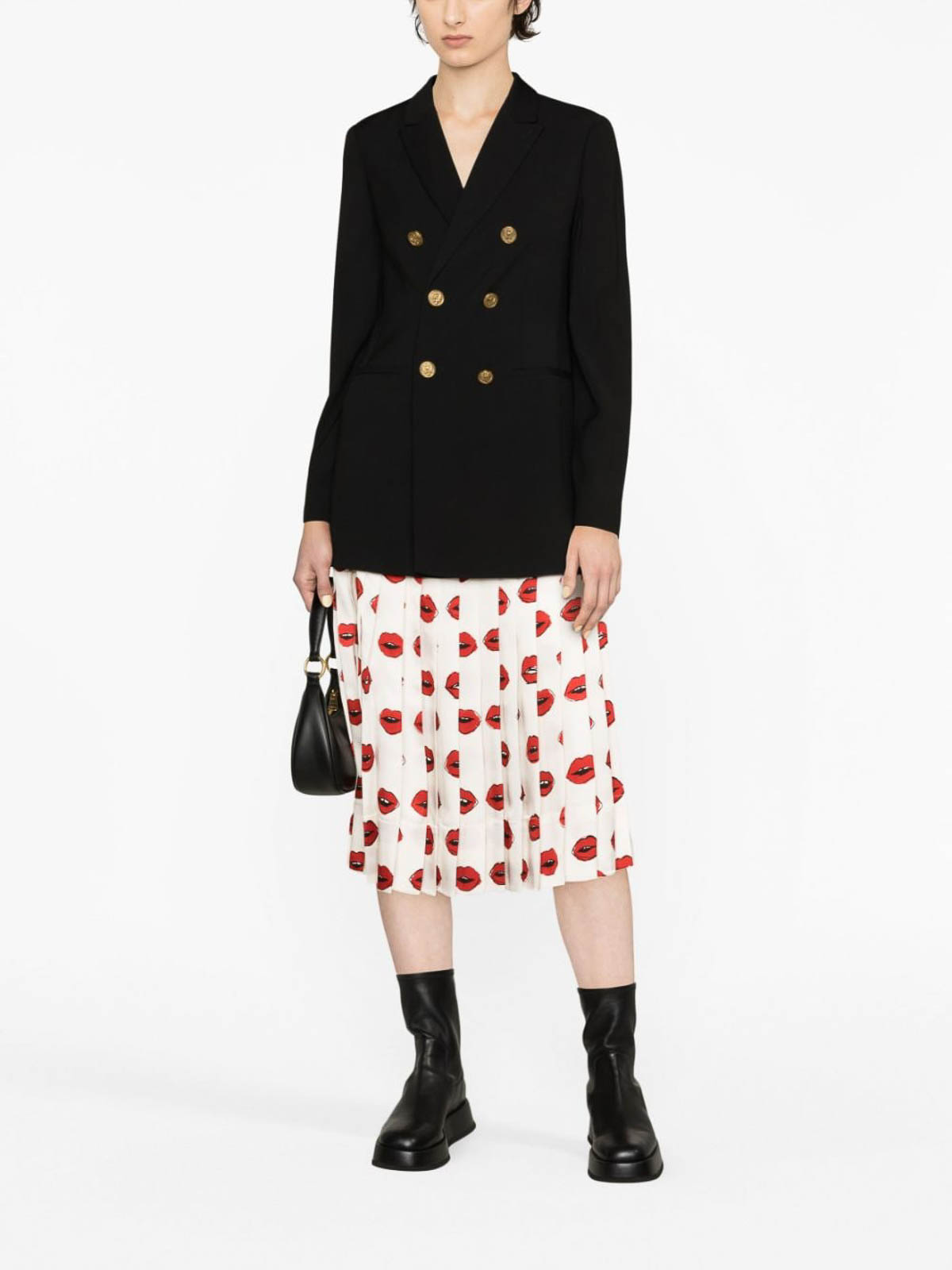 レッドヴァレンティノのダブルブレストギャバジンブレザーは、ブラックのギャバジン織りのゴールドトーンのボタン、ダブルブレストのボタン留め、ピークラペル、フロントに2つのウェルトポケット、長袖、ボタン付きカフス、ストレートヘムが特徴です。