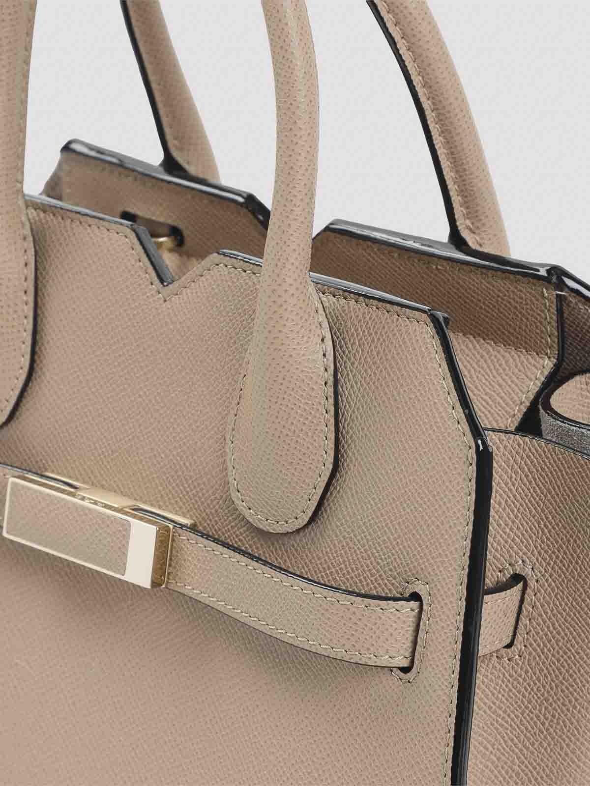 Valextra ベージュカシミアカーフレザーミラノミニハンドバッグ。ピュアベージュのカシミヤカーフレザーハンドバッグ、トップハンドル、上部マグネットファスナー、フロントレザーストラップ、フロントバックル、調節可能で取り外し可能なショルダーストラップ、インナーロゴ、インナーポケット、メインコンパートメント1つ。ゴールドトーンのハードウェア。
