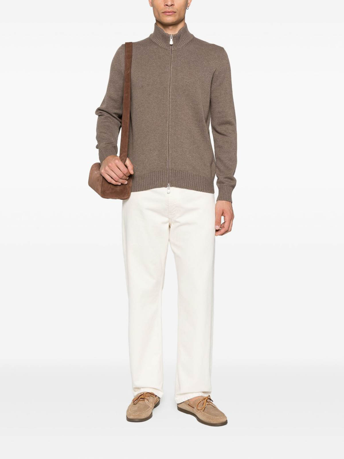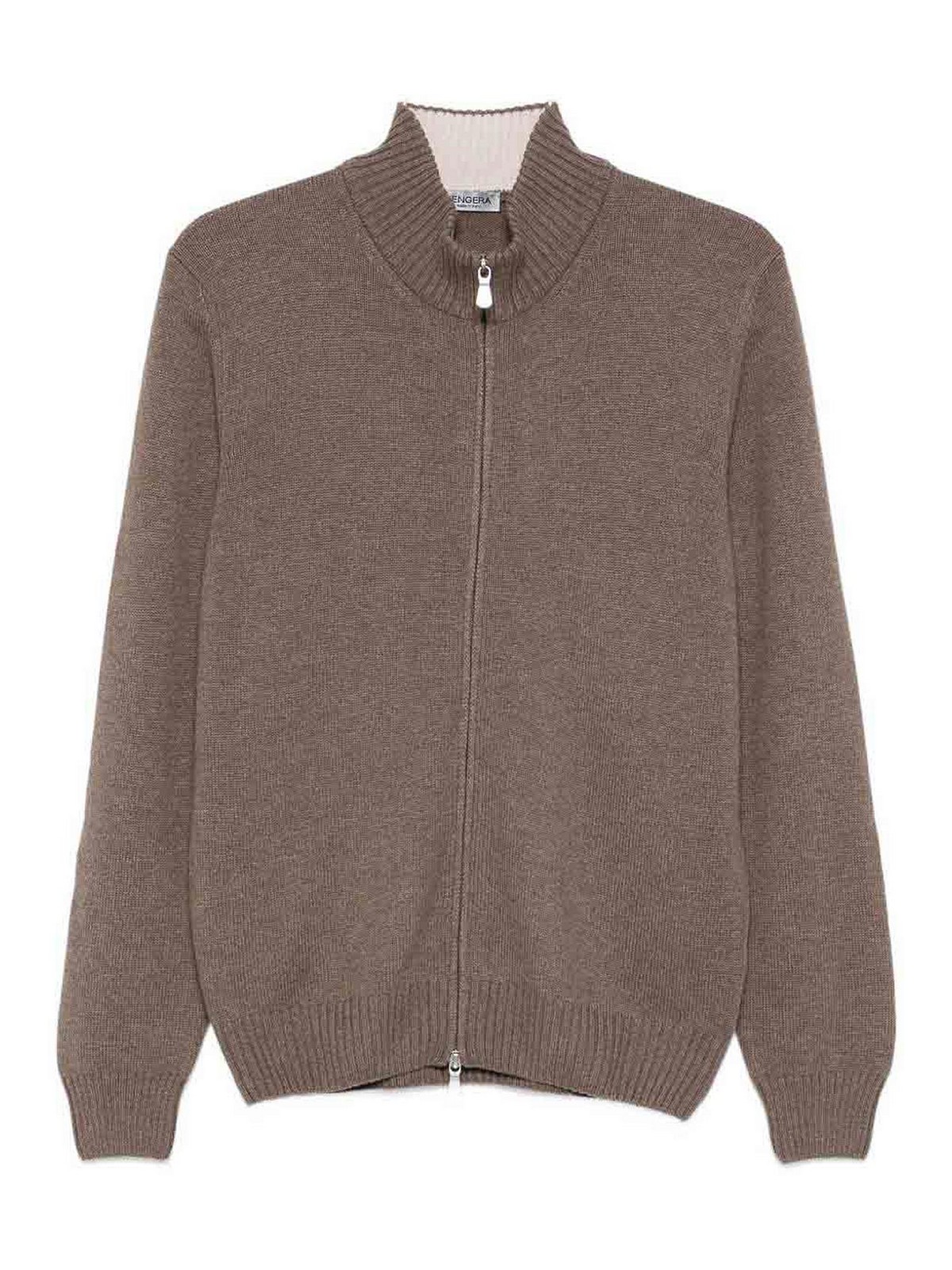 ブラウンニットジップモックネックロングスリーブリブ付きヘム