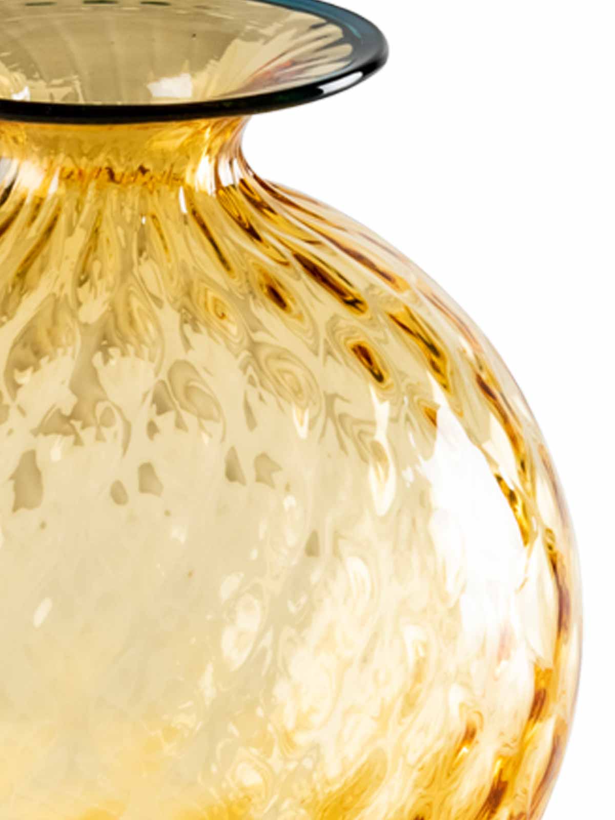 モノフィオーレバルーンのガラス花瓶。見た目は柔らかいのにガラスです。1970年のヴェニーニ・モノフィオリの目の錯覚は、その名の通り、表面にマトラスのような効果を再現するユニークなプロセスであるバルーンです。作品は手作りで、特徴的な金属型を吹き込み、細いネックに熱い色の糸を当てて仕上げています。