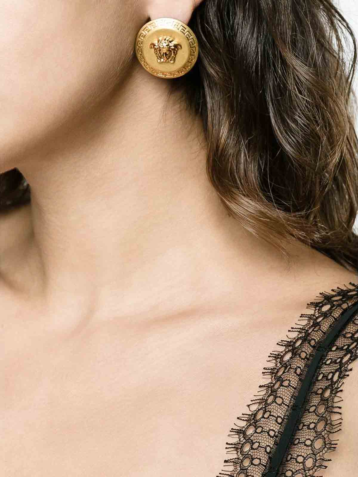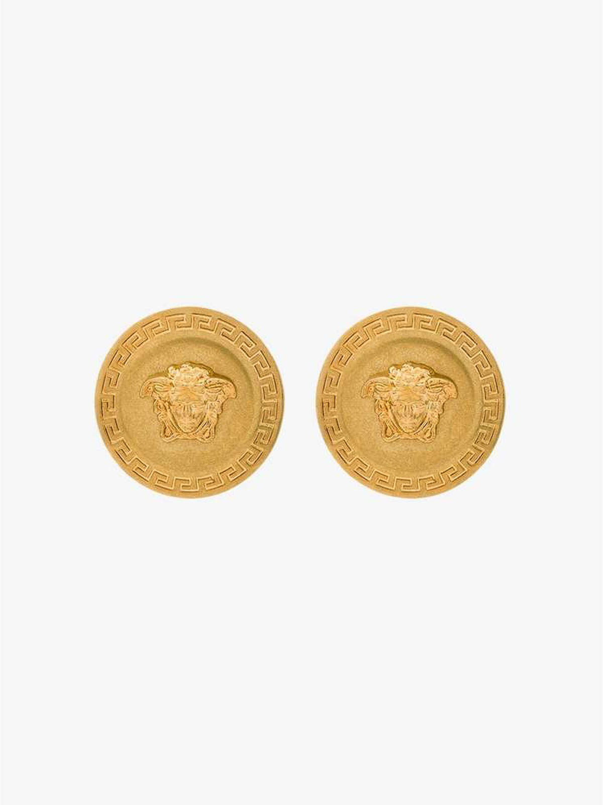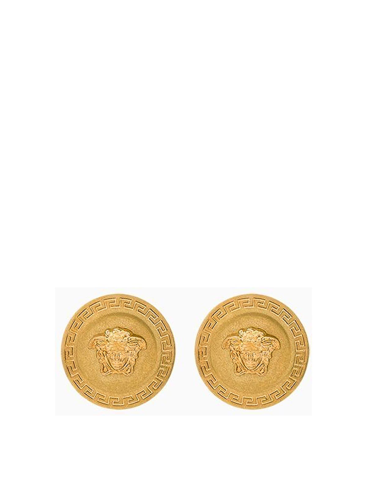 ゴールドシグネチャーのグレカディテールをあしらったメデューサヘッドモチーフのポストバック 2個セット。このピアスはペアでお届けします