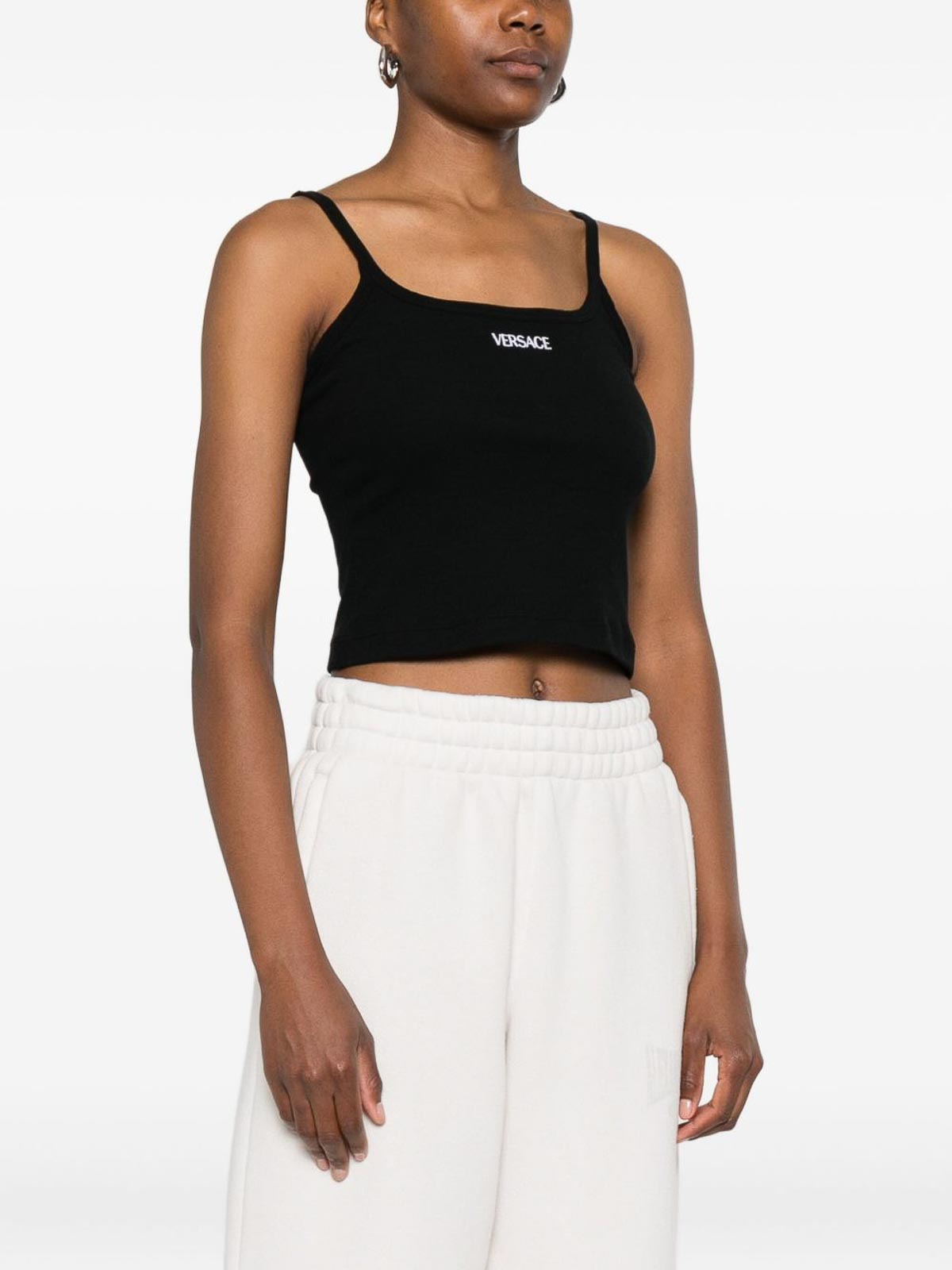 細いショルダーストラップとversaceロゴ付きブラックストレッチトップ
