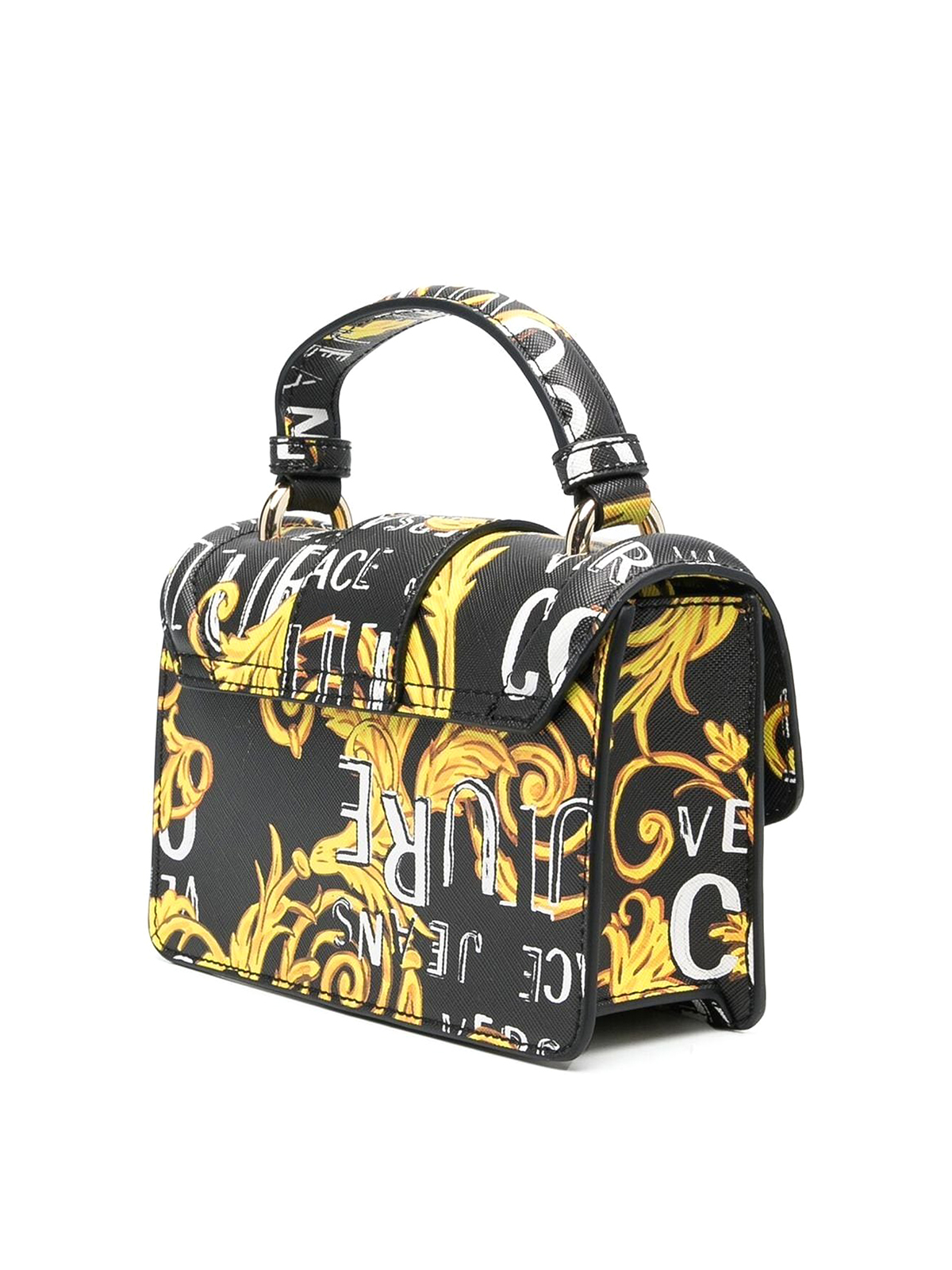 ヴェルサーチジーンズクチュールのバロック柄プリントトートバッグ。人工皮革、バロック柄プリント、刻印入りロゴ、バックル留め、シングルフラットトップハンドル、チェーンリンクショルダーストラップ、ブラック/イエローが特徴です。