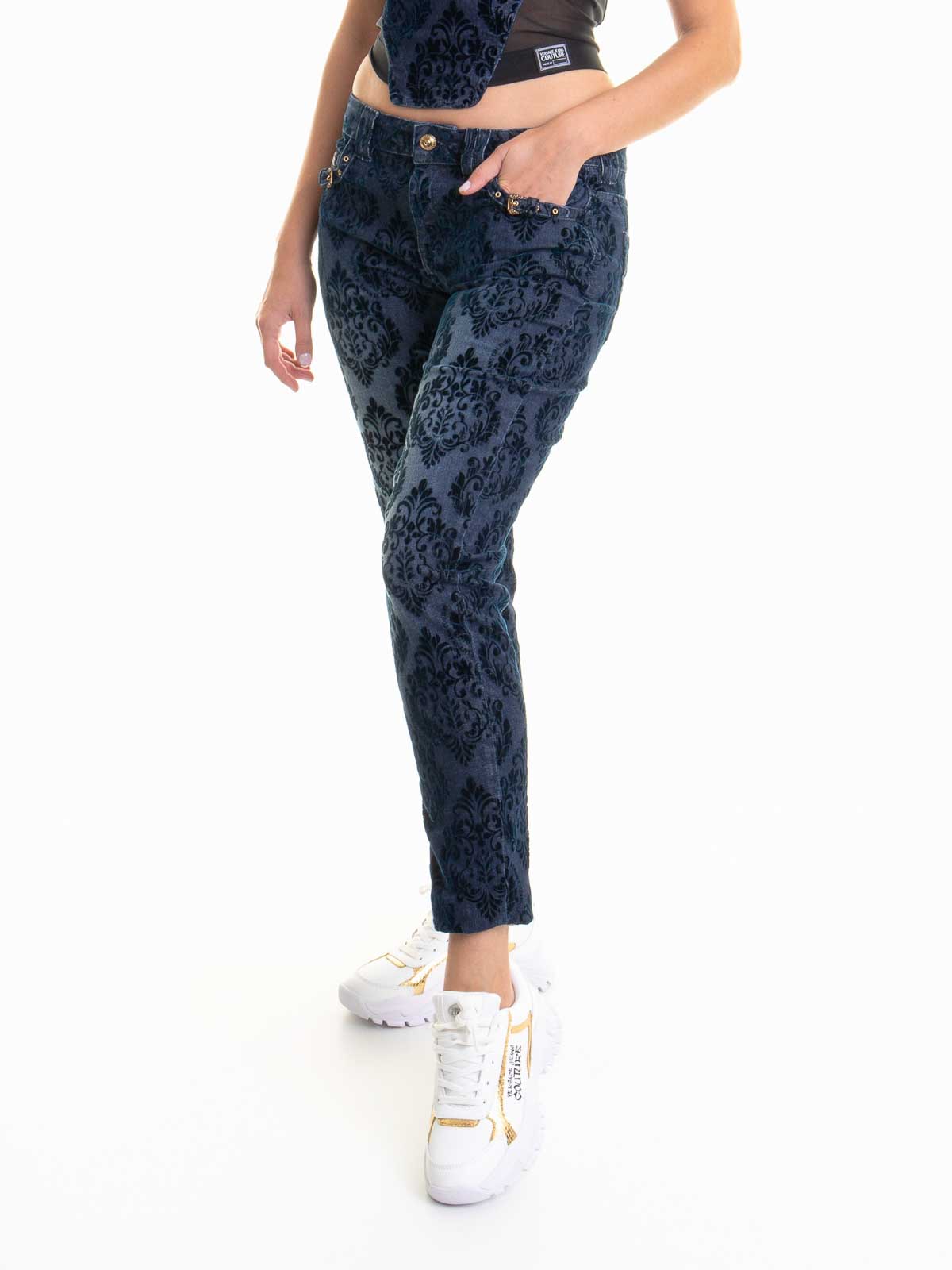 バックルロゴファンタジープリント付きジッパーとボタン付きファイブポケット