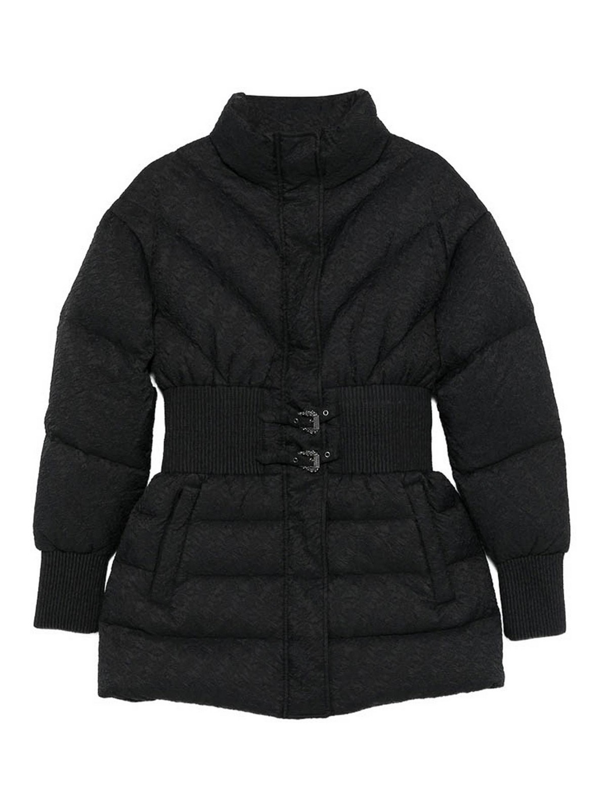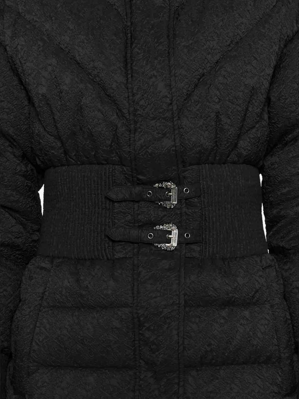 ブラックキルトデザインベルト付きウエストバックルスタンドカラーロングスリーブ