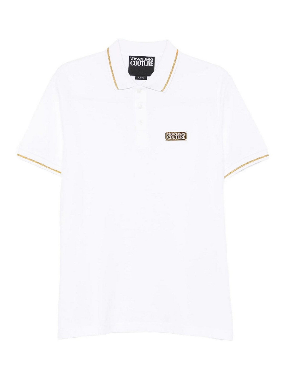 ホワイトトリムショートスリーブボタンエンブロイダリーロゴリブ編みの襟