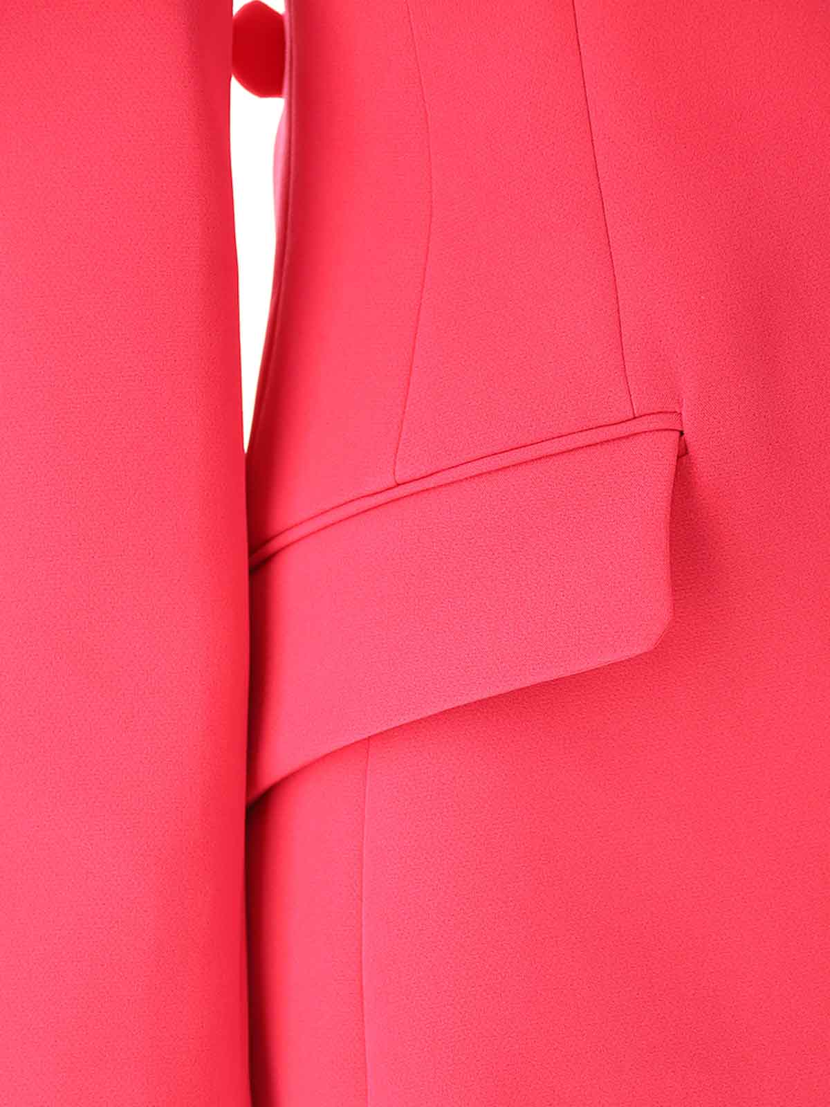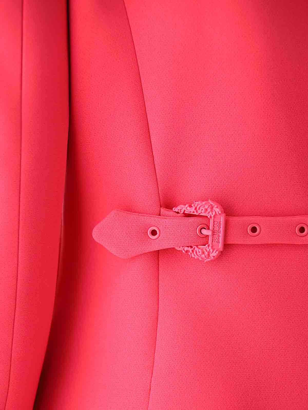 フューシャバロックバックル付きブレザー、ロゴ入りトーン・オン・トーンのVエンブレムボタン付きフロントクロージャー付きシングルブレストフクシアブレザー、ピークラペル、背面にロゴ入りフクシアバロックバックル付きの調節可能なストラップ。、バロックバックル Vエンブレムカスタマイズロングスリーブピークラペルフロントボタンクロージャーリアベント、色:フクシア、93%ポリエステル、7%エラスタン裏地:52 ビスコース, 48% アセテート.