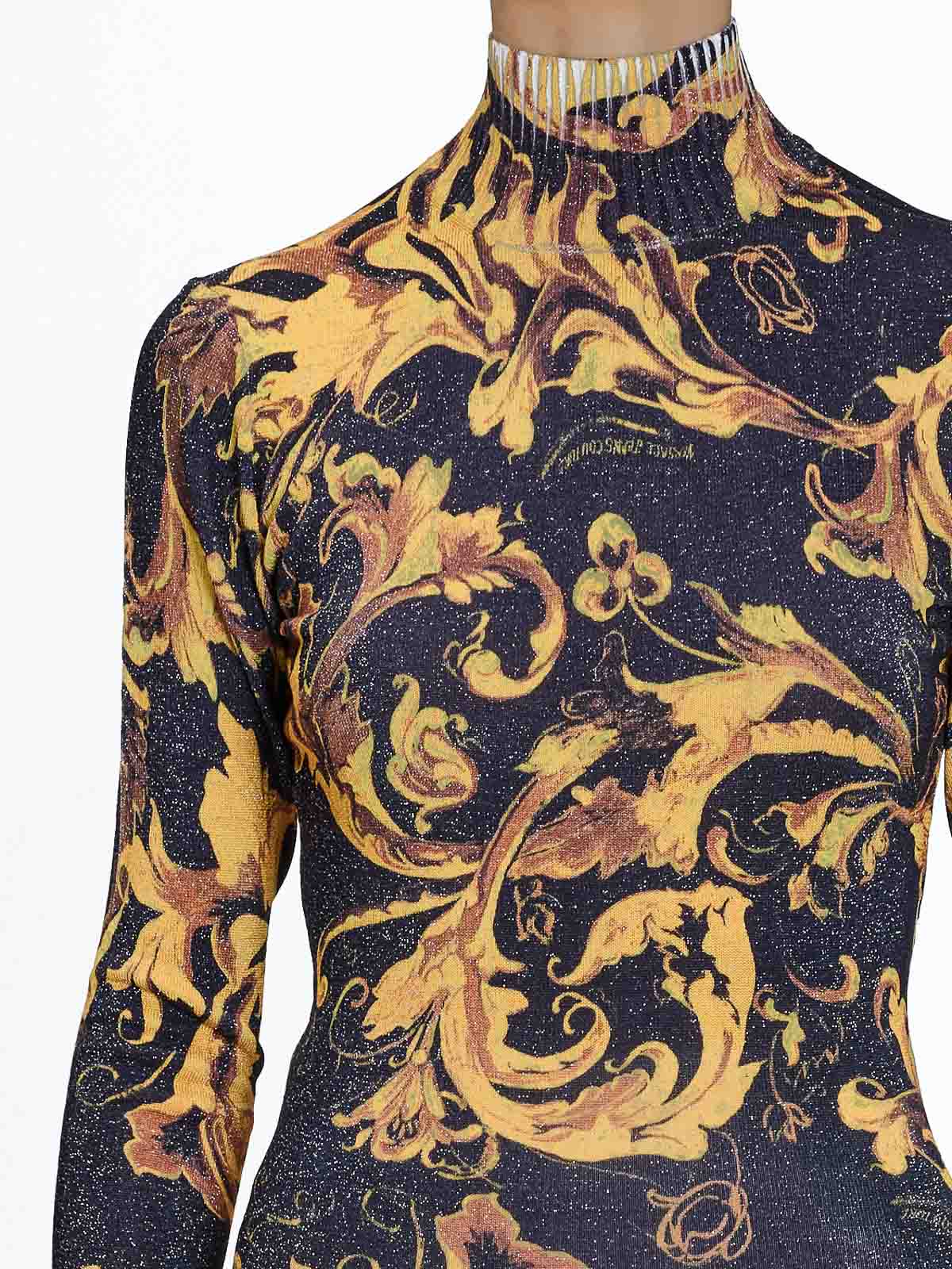 バロックニットのタートルネック。メタリックフィラメントをあしらったニット生地が特徴の、全体にバロック様式のプリントが施されたヴェルサーチのタートルネック。バロックプリント、ニット生地、メタリックフィラメント、タートルネック、リブ編みの襟、裾、袖口。カラー:ブラック/マルチビスコース 90%、メタリックファイバー 10%