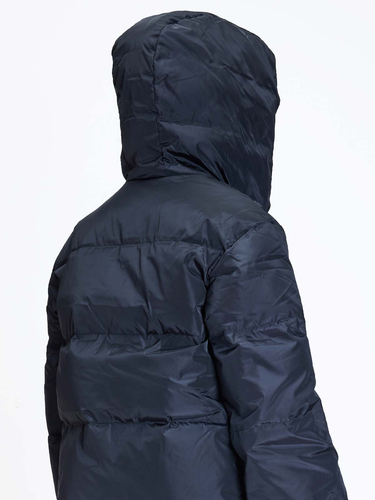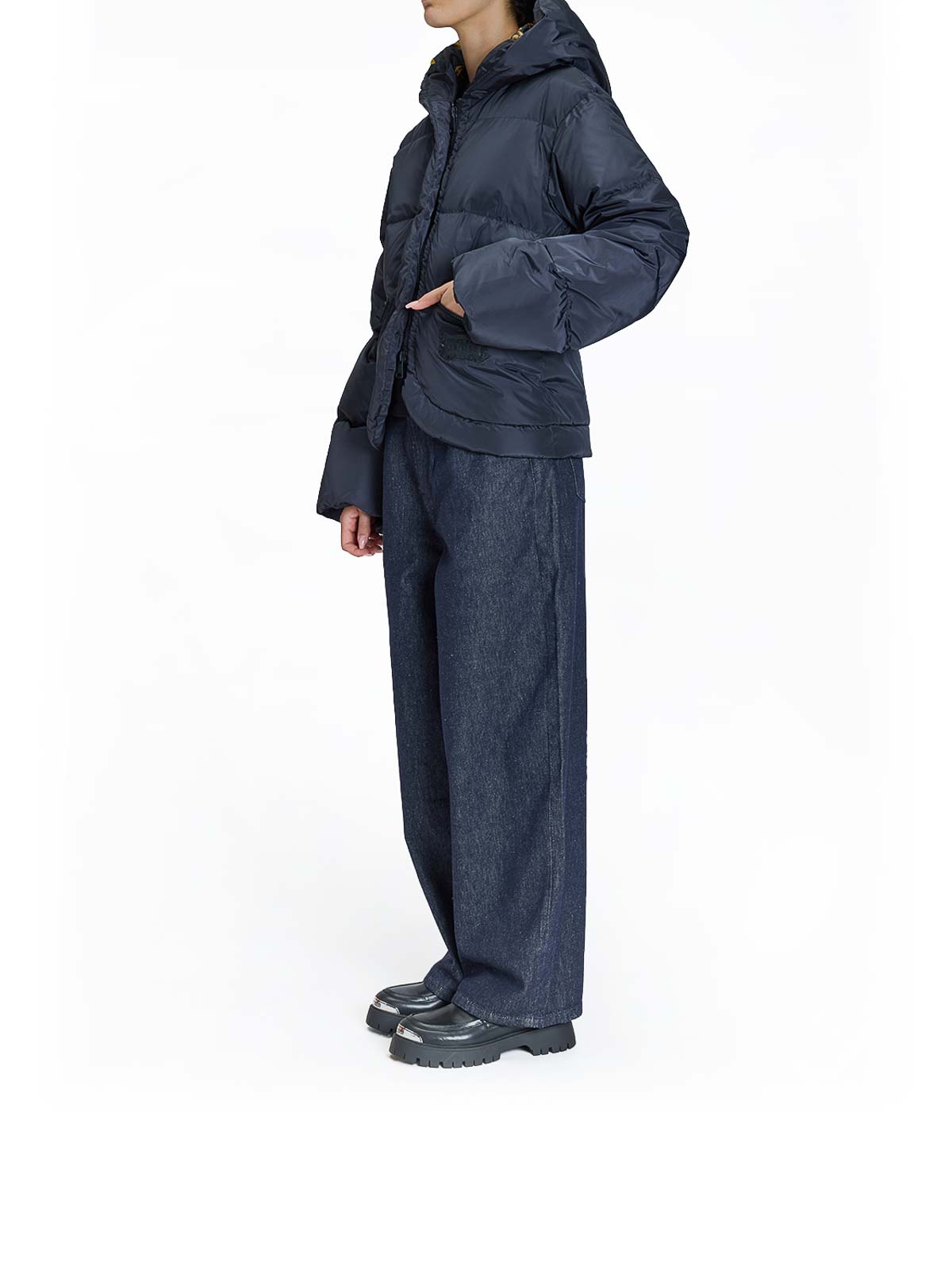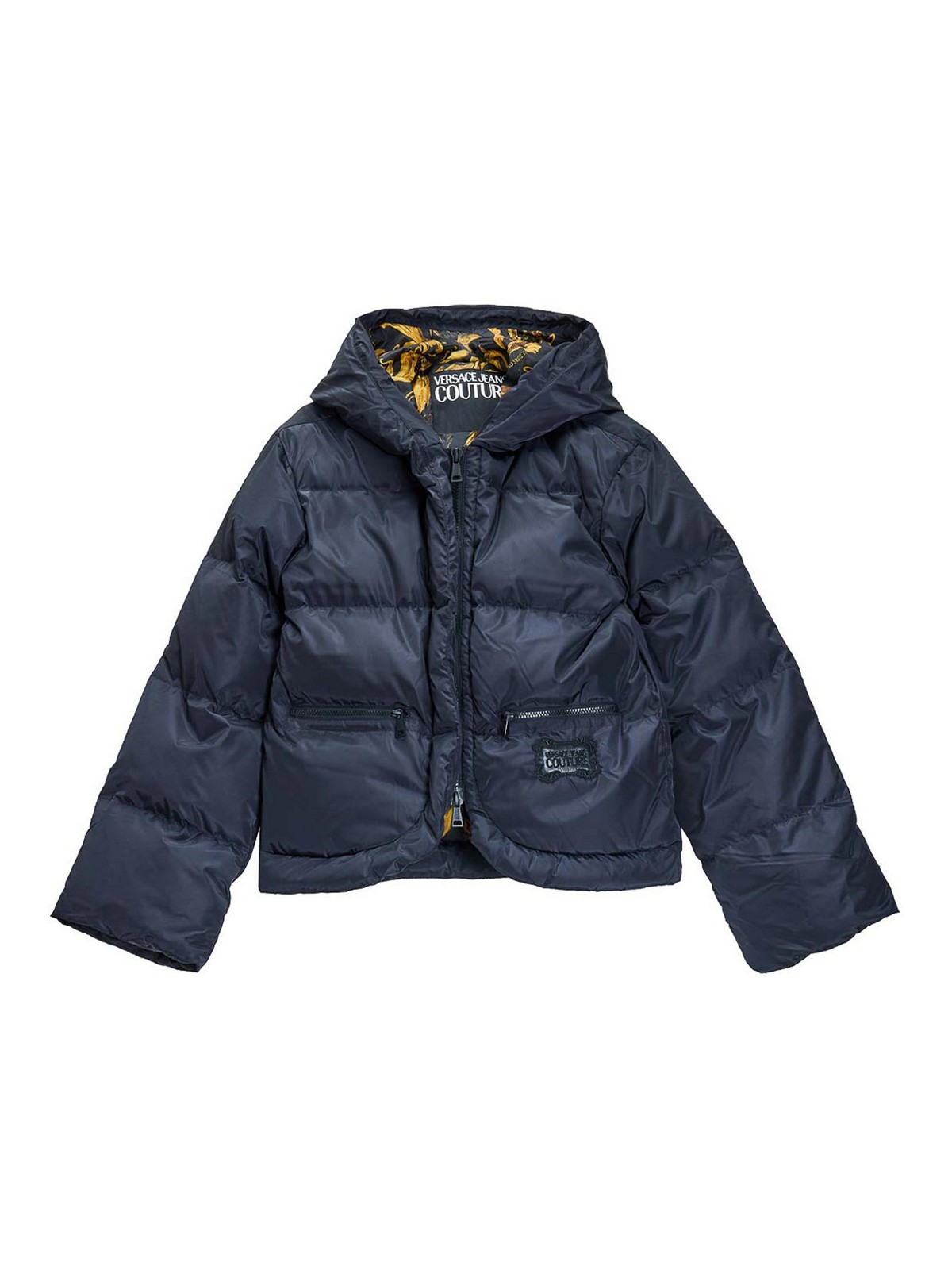 バロックスタイルのショートダウンジャケット。カラーはブラック。Versace ショートダウンジャケット。キルティングデザイン、ドローストリング付きフード、バロック調の裏地付き。サイドにファスナーポケットが2つと、刺繍されたロゴアップリケが特徴です。キルトデザイン、ドローストリングフード、バロック調の裏地、ファスナー付きポケット2つ、ジップクロージャー、刺繍入りロゴアップリケ付き。カラー:ブラック。100% ポリエステル。