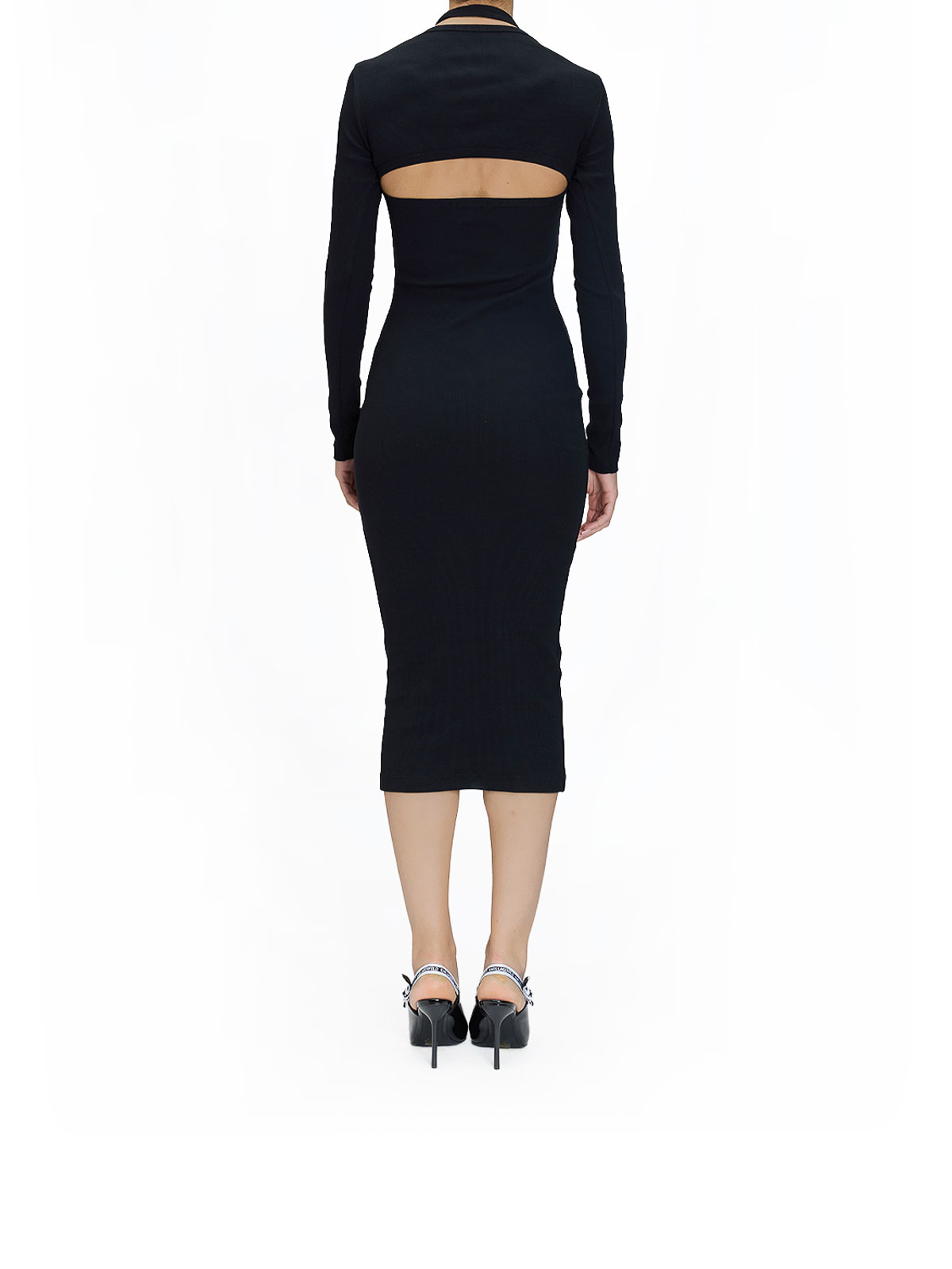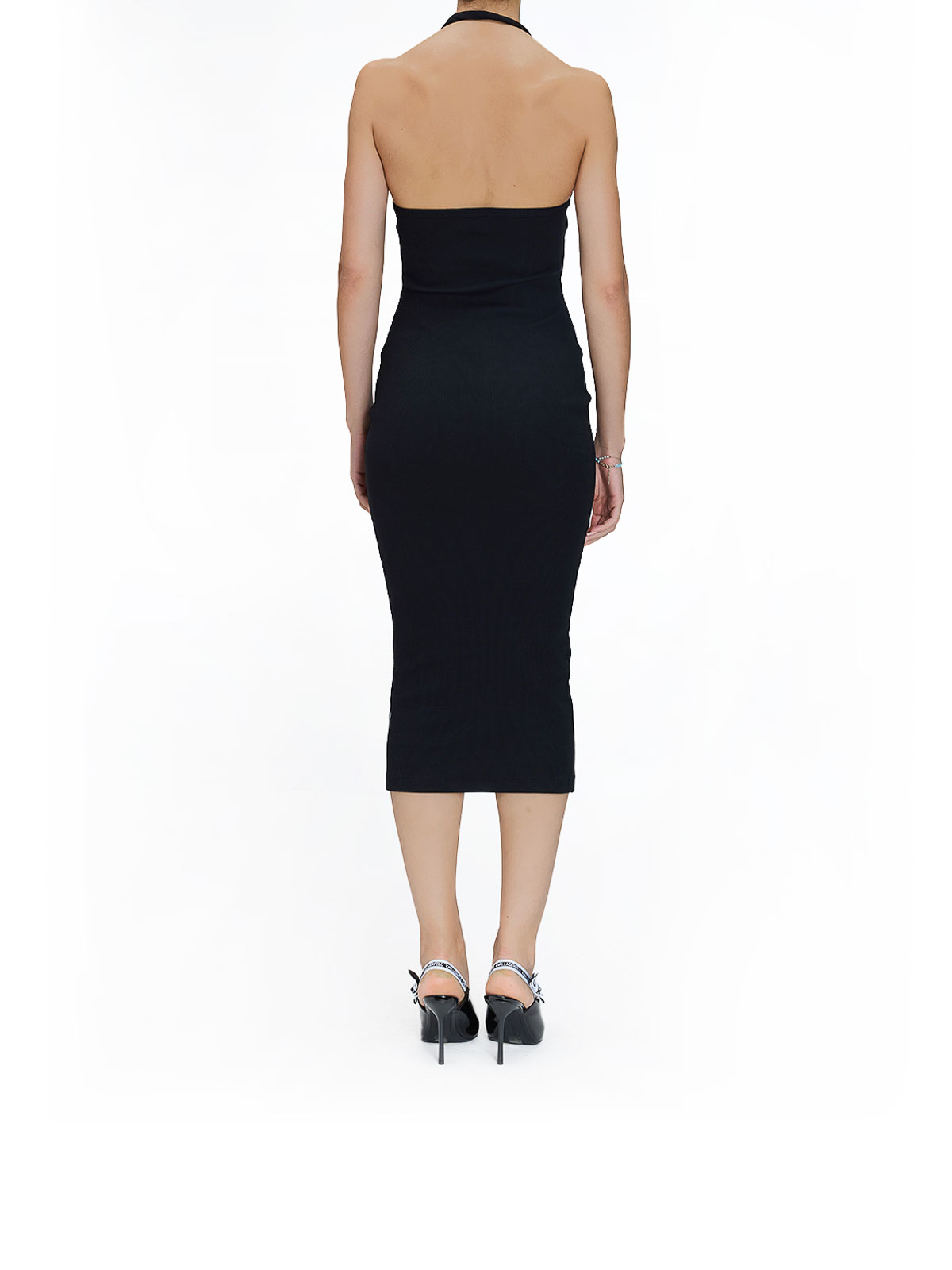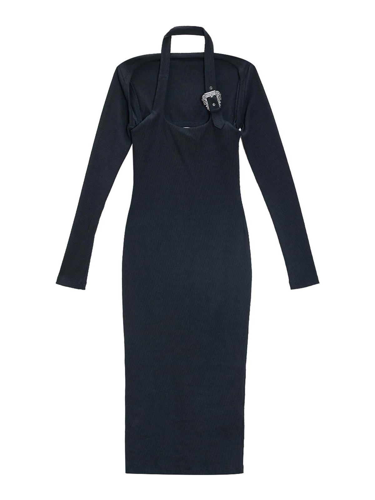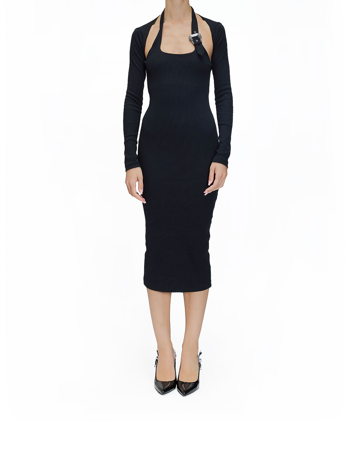 バックルのロングドレス。カラーはブラック。Versace リブ編みミディドレス、肩をすくめたデザイン、取り外し可能なマッチングセット。スクエアネック、ホルターネック、バロックバックルのディテールが特徴です。リブ編みニット、お揃いのシュラグ、スクエアネック、ホルターネック、バロックバックルのディテール。カラー:ブラック。コットン 98%、エラステイン 2%。イタリア製。