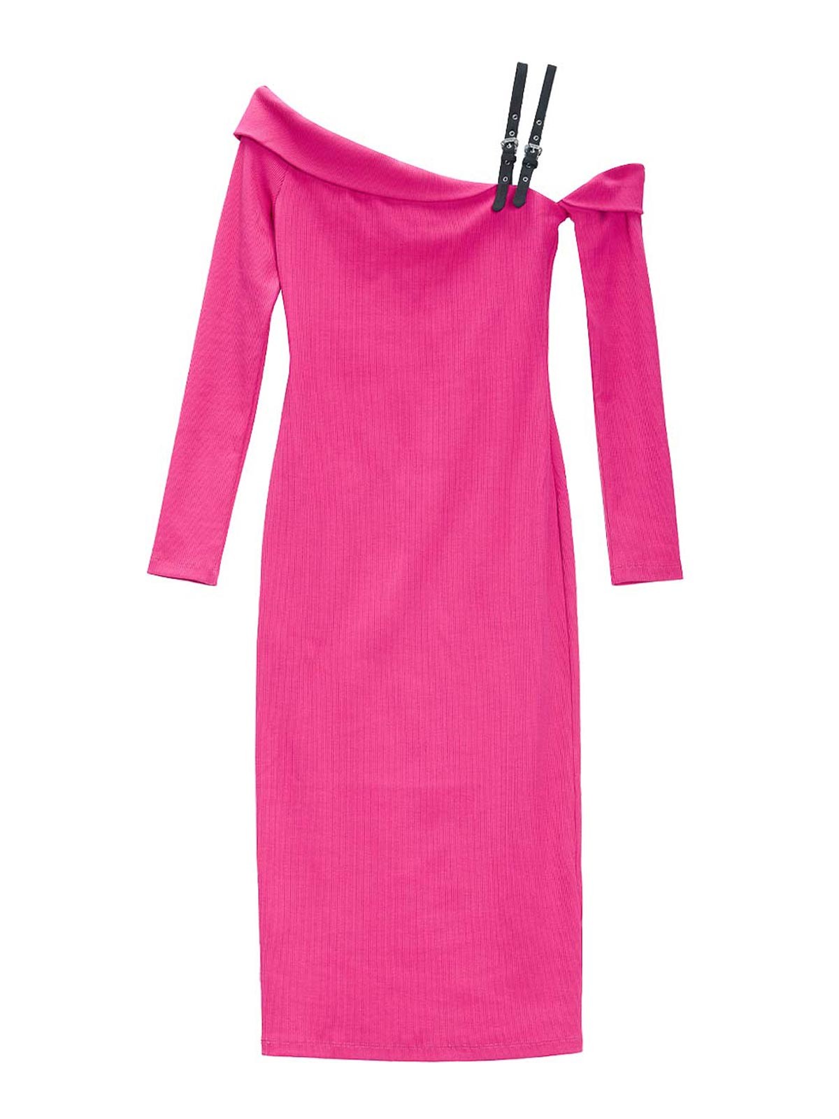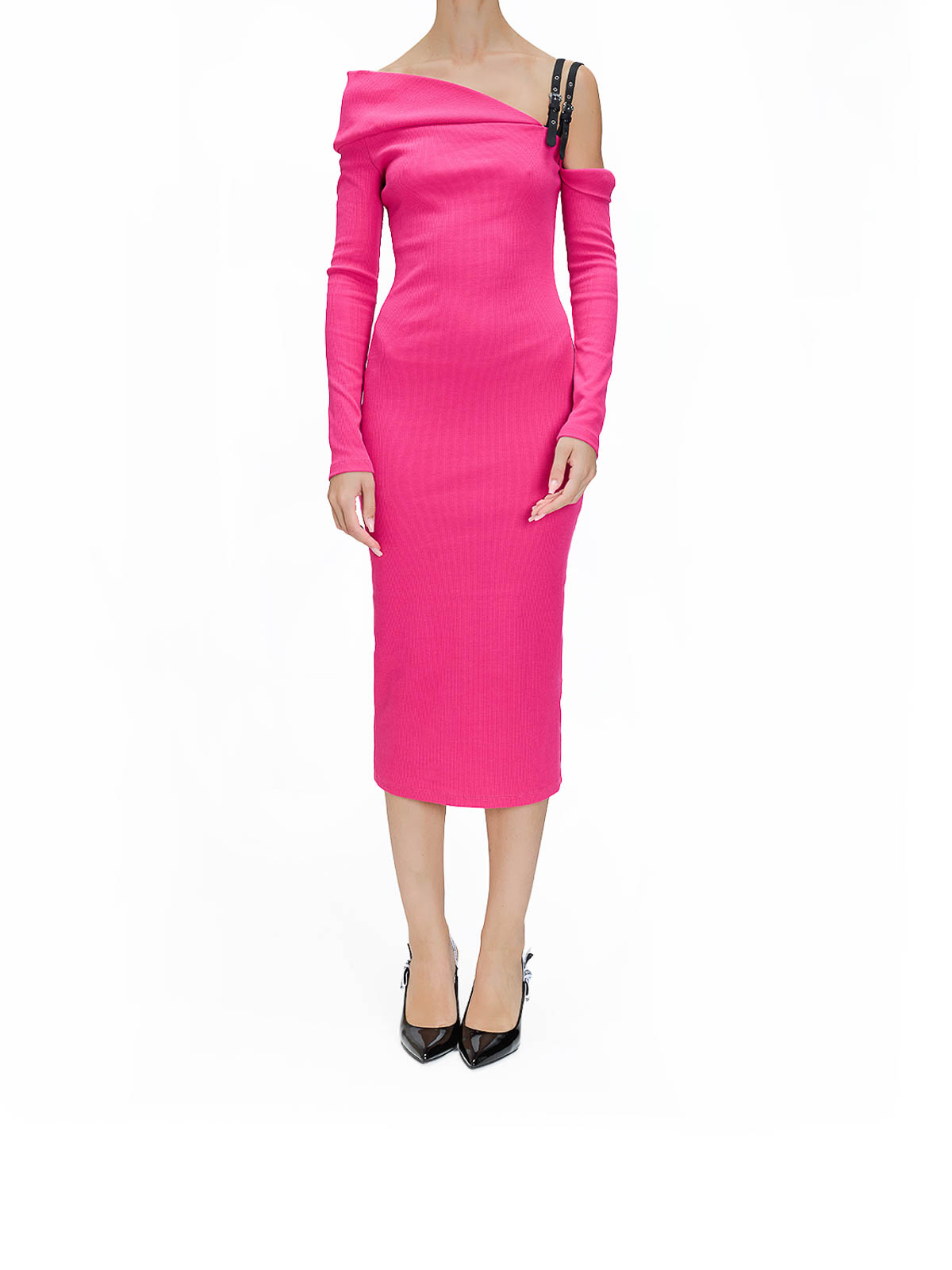 ピンクのバックルドレス。Versace ロングスリーブのリブ編みミディドレス。オフショルダーのディテールをあしらい、ショルダーストラップとして機能するコントラストの効いたバックルストラップが 2 本あしらわれています。リブニット、ロングスリーブ、オフショルダー、ボートネック、バックルストラップ。カラー:ピンク。綿 98%、エラステイン 2%。イタリア製。