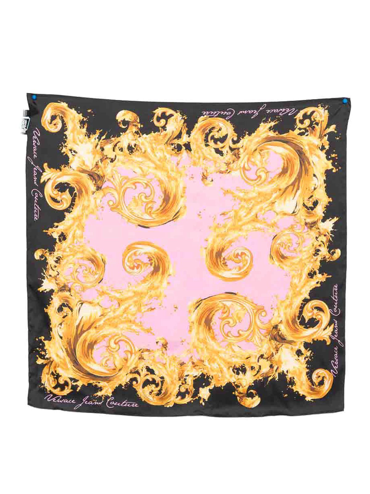 ヴェルサーチジーンズクチュールのゴールドとブラックのプリントをあしらったシルクのフーラード