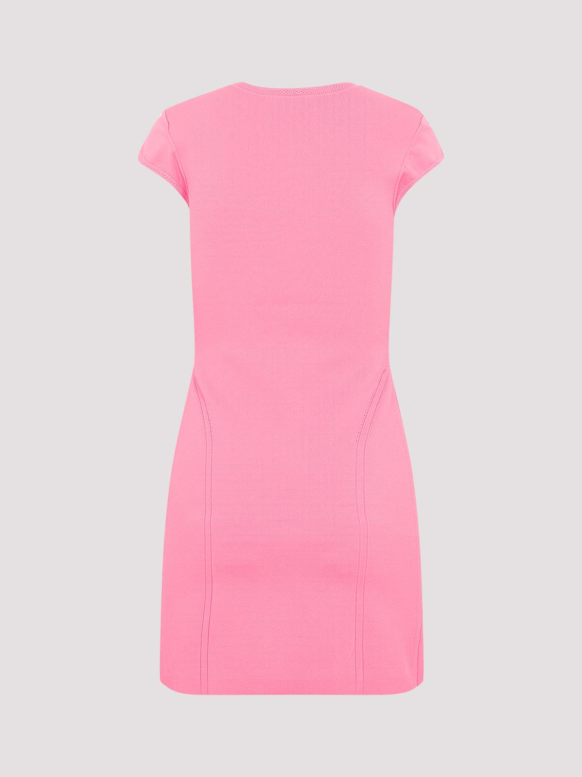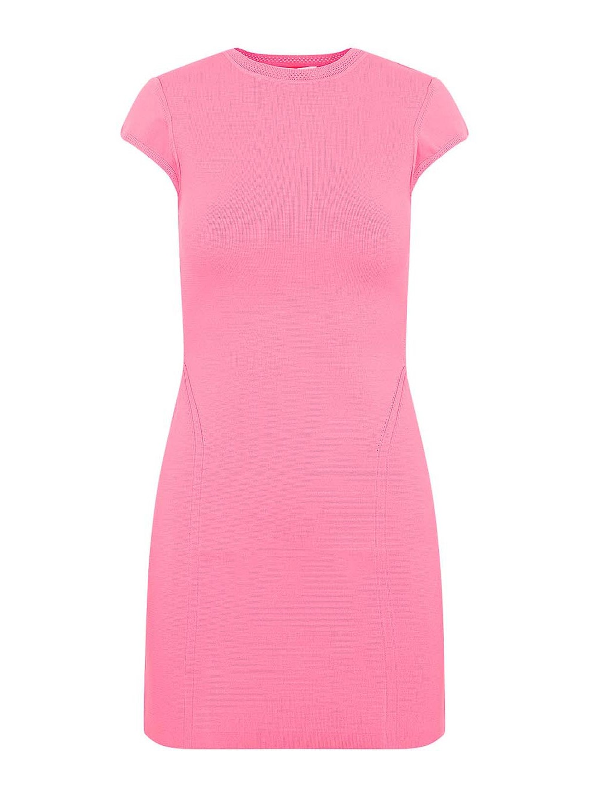 Victoria Beckham ピンクキャップスリーブフィットミニドレス。ピンクのテックファブリックブレンドで作られています。クルーネック、キャップスリーブ、透かし彫りのディテール、ストレートヘム。