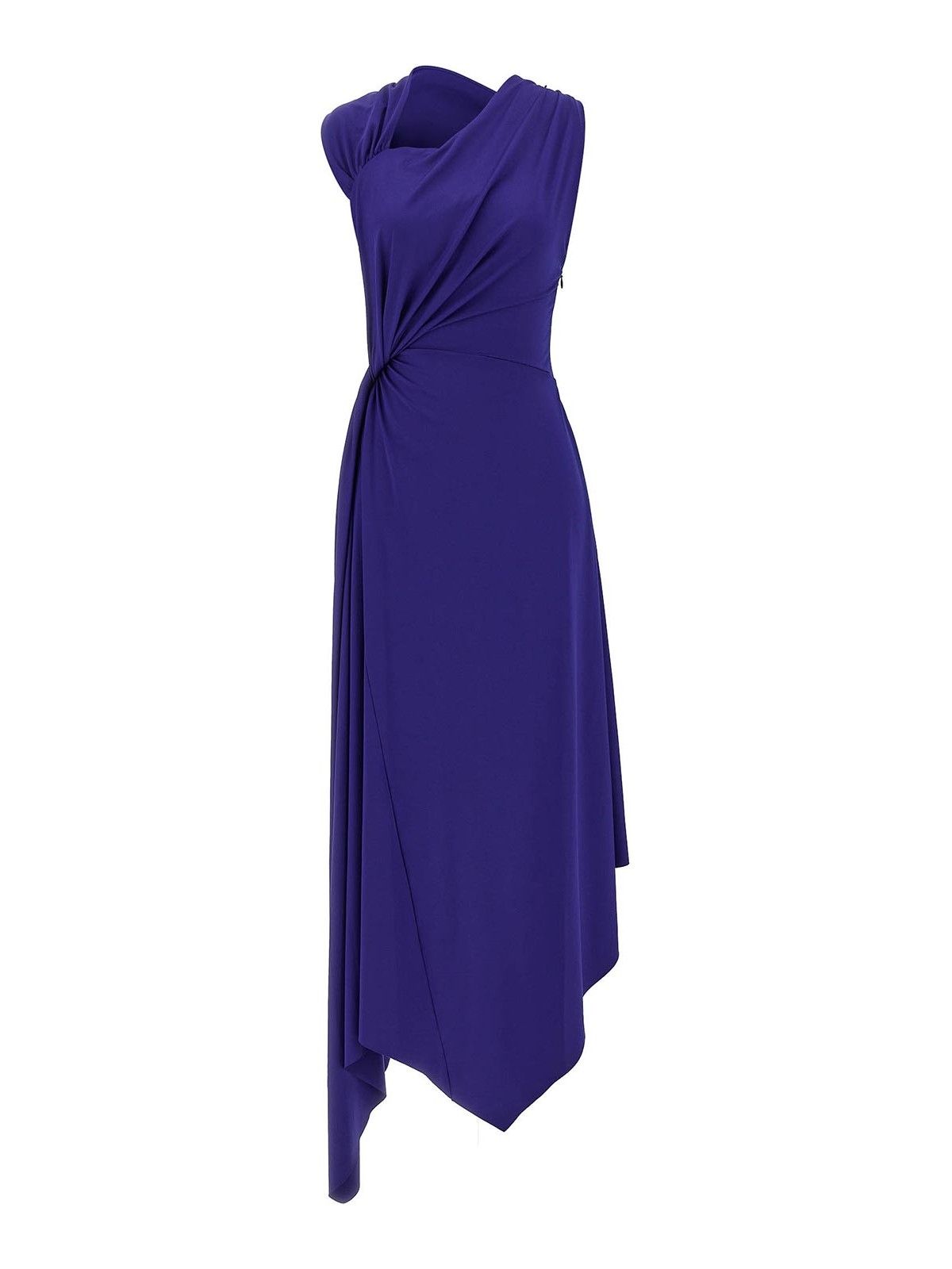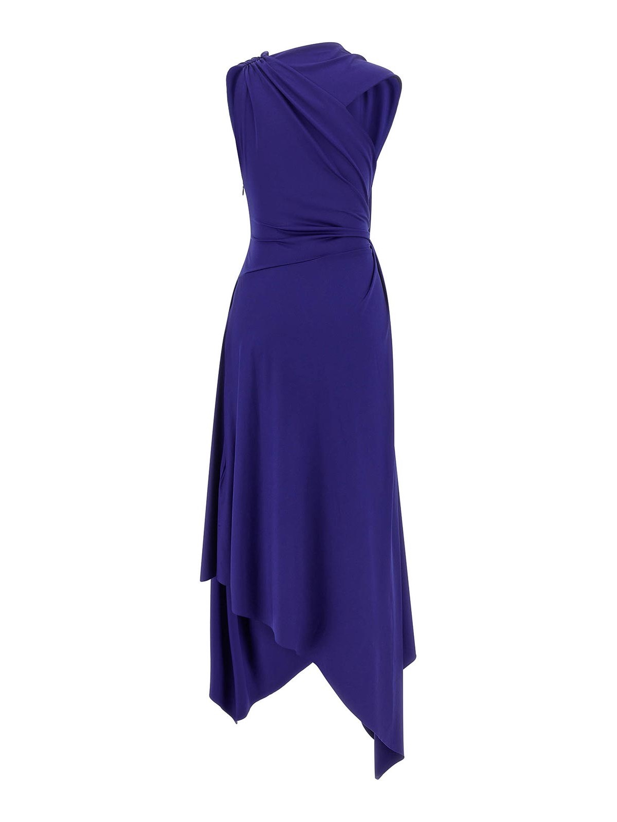 ストレッチ素材を使用したフルイドドレープのミディドレス。非対称のネックライン、ノースリーブ、しわの入ったディテールで胸元はタイトで、サイドクロージャーには隠しファスナー付き、長さは左右非対称です。