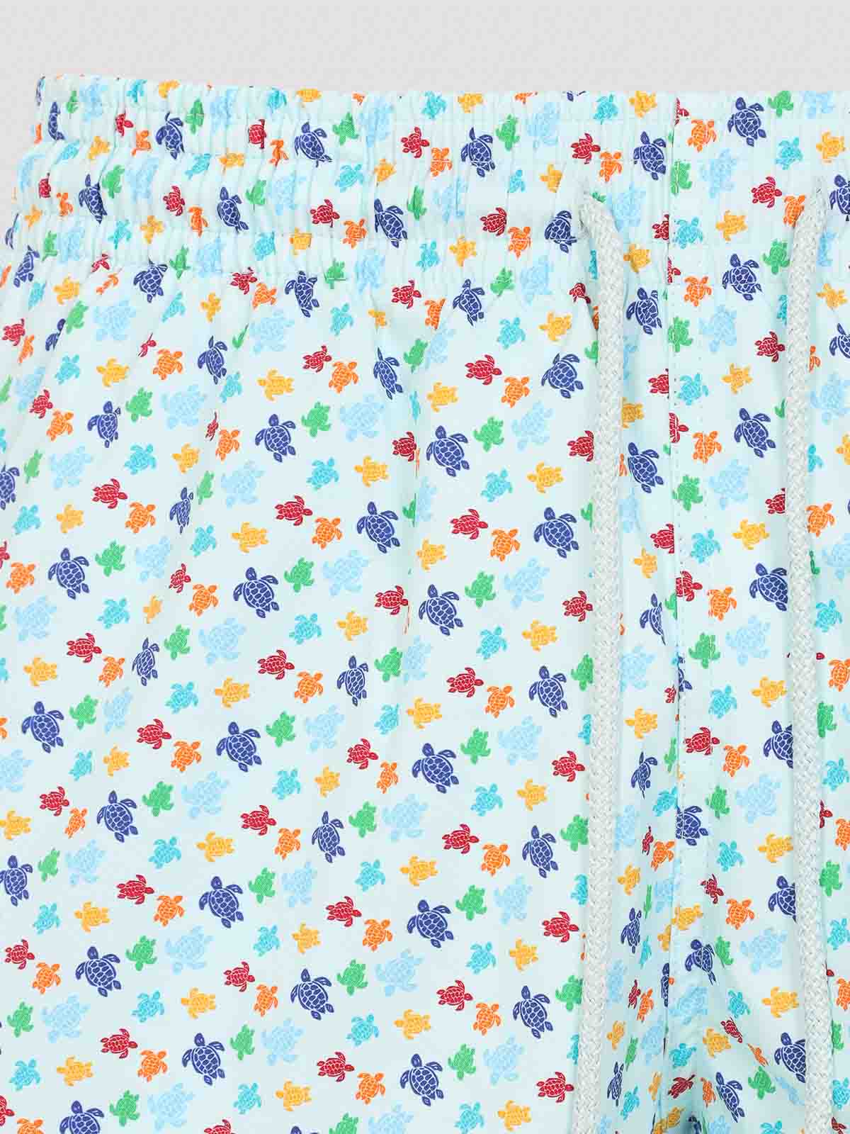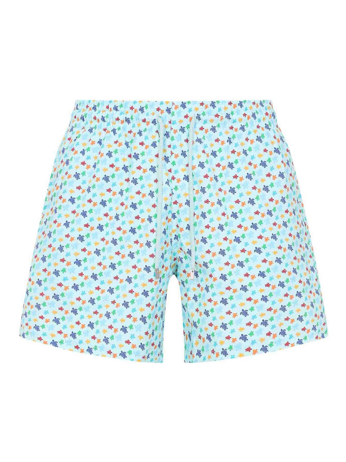 Vilebrequin moorise ライトブルーポリエステルスイムショーツ。ライトブルーのリサイクルテックファブリック製、シグネチャーミニタートルプリント、ドローストリング付きの伸縮性ウエストバンド、サイドポケット、背面にフラップポケット1つ、背面にアイレットとブランドラベル、ストレートヘム。