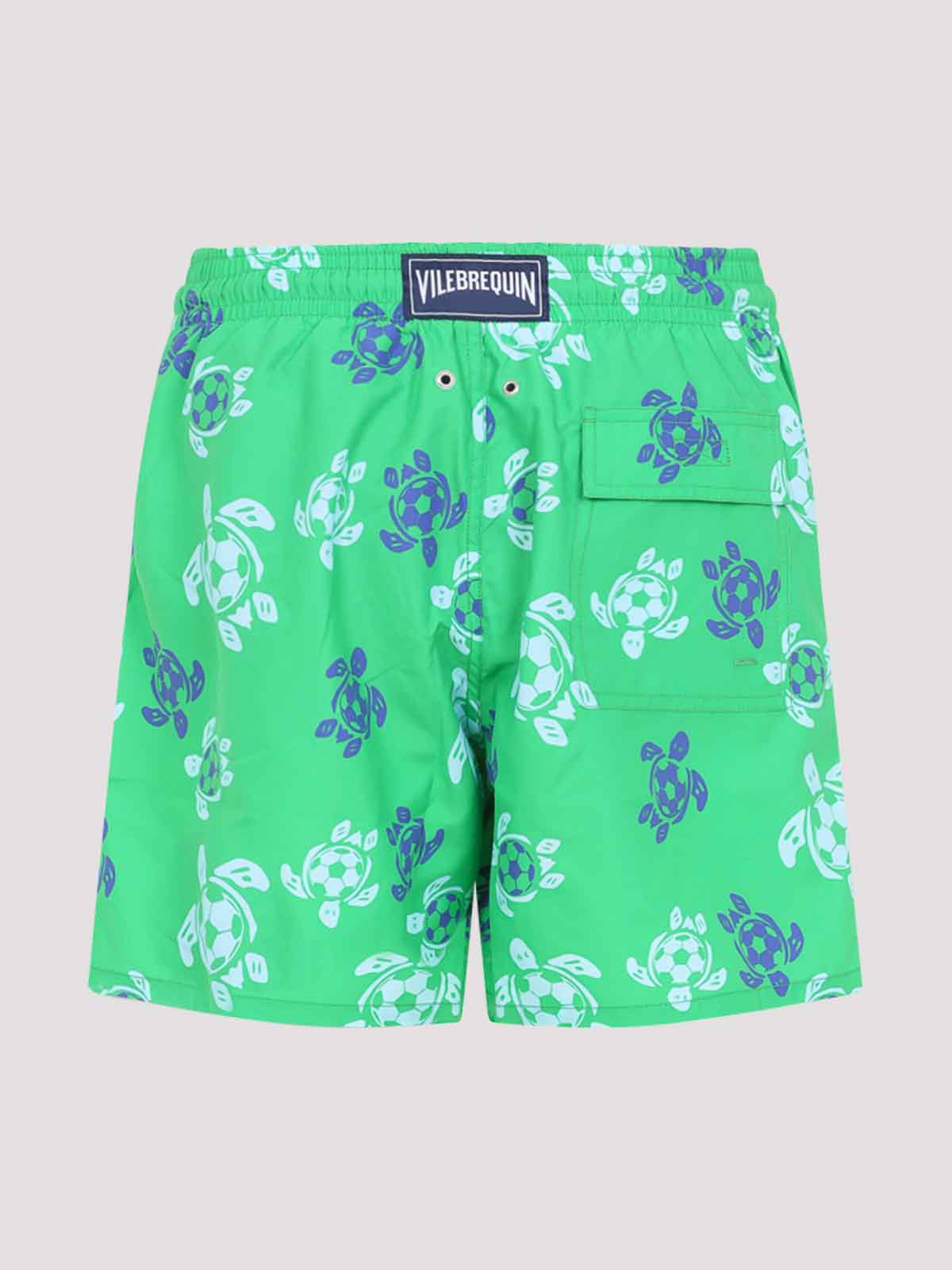 Vilebrequin moorea green リサイクルポリエステルスイムショーツ。全体にサッカータートルのモチーフをあしらったグリーンテックファブリック製で、ドローストリング付きの伸縮性ウエストバンド、サイドポケット2つ、ベルクロフラップ付きのバックポケット1つ、バックアイレット2つが特徴です。サイズ通りにフィットし、レギュラーフィットです。