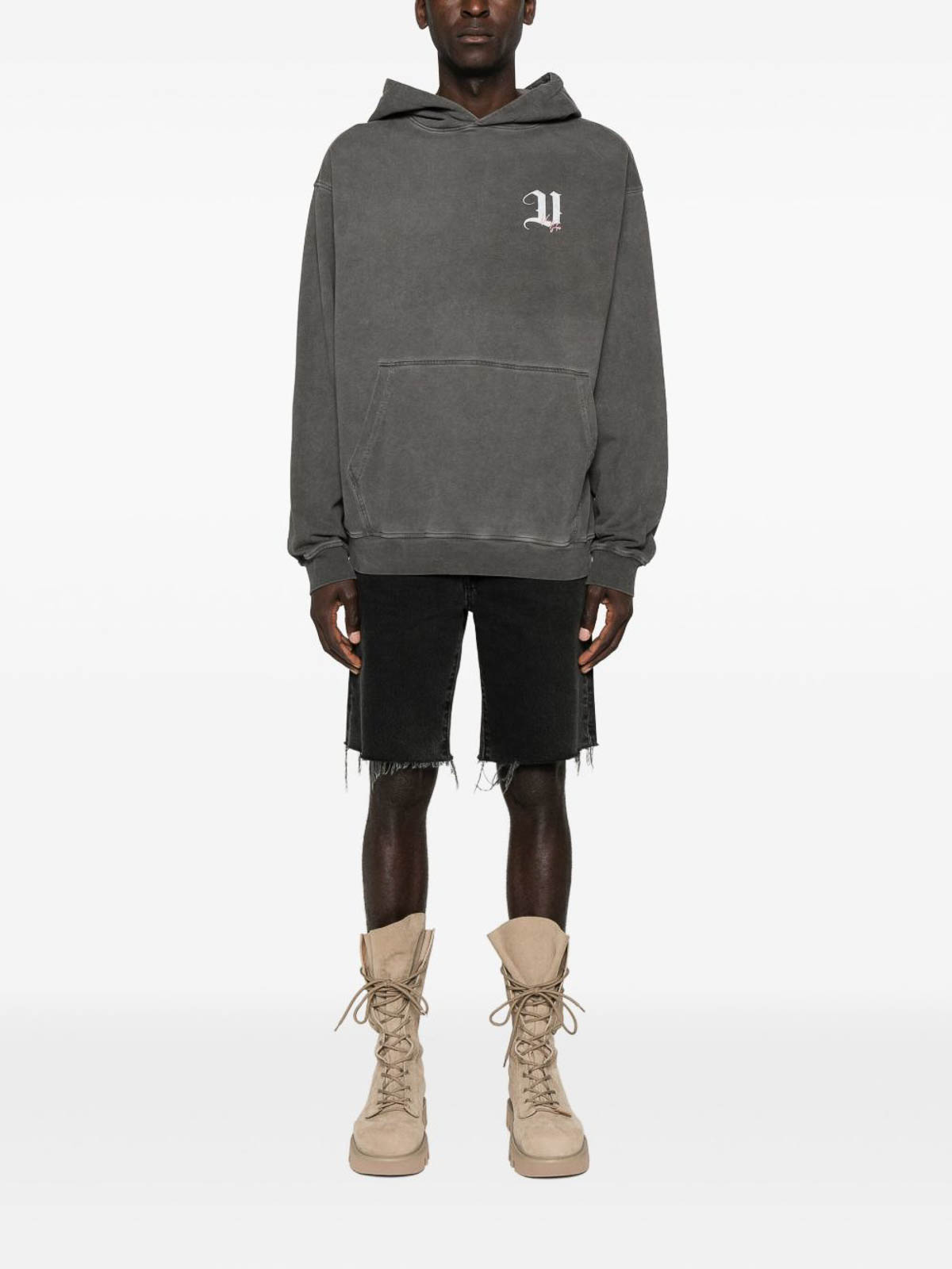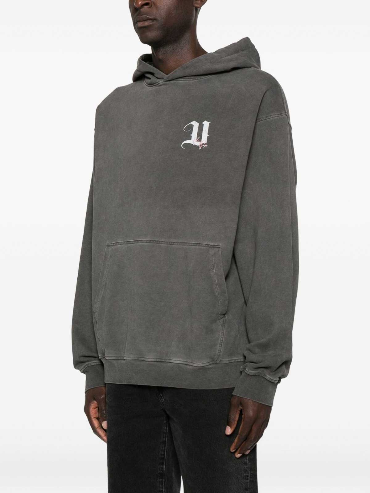 グレーのロゴプリントポーチポケット、長袖、リブ編みの裾、袖口