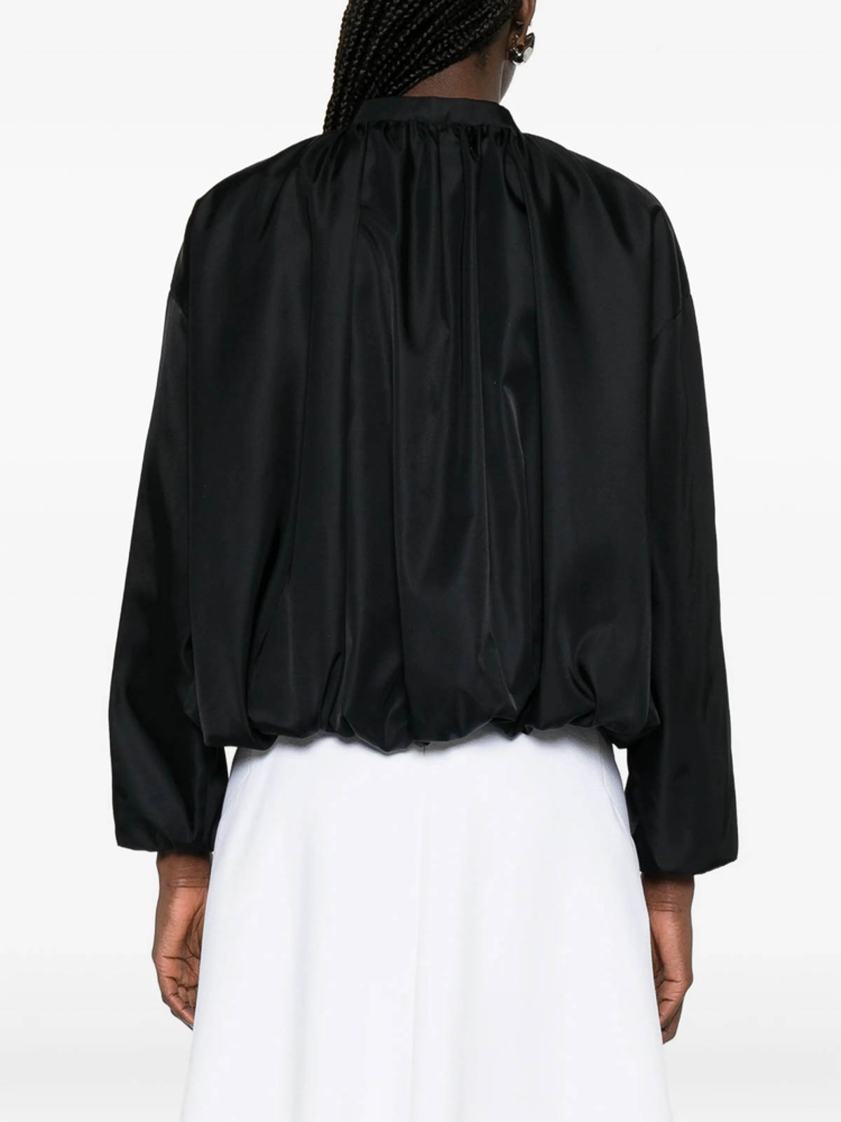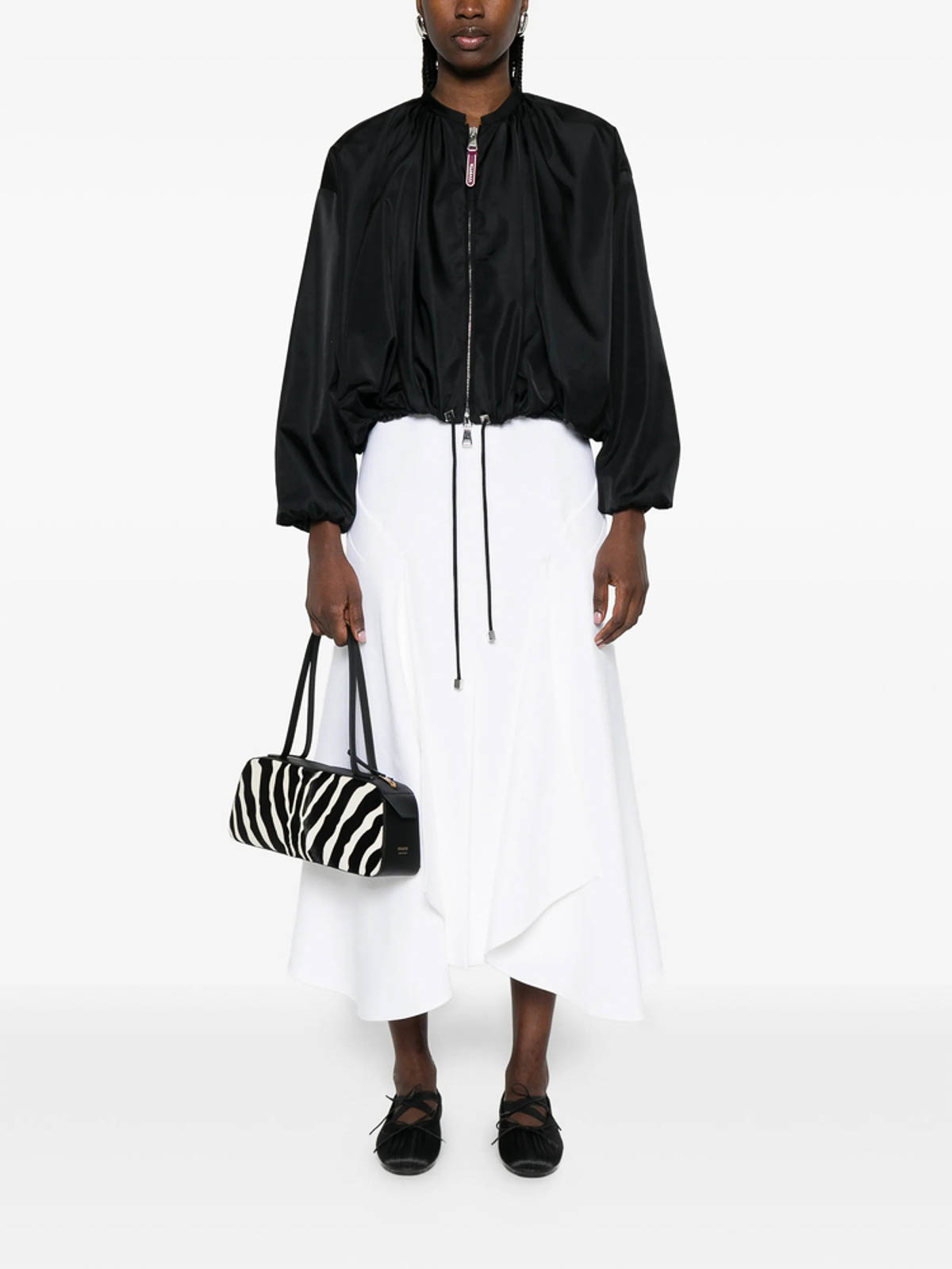 ブラックシルバートーンの金具ファスナー開閉式ドローストリングヘムゴム入りカフスラウンドネック