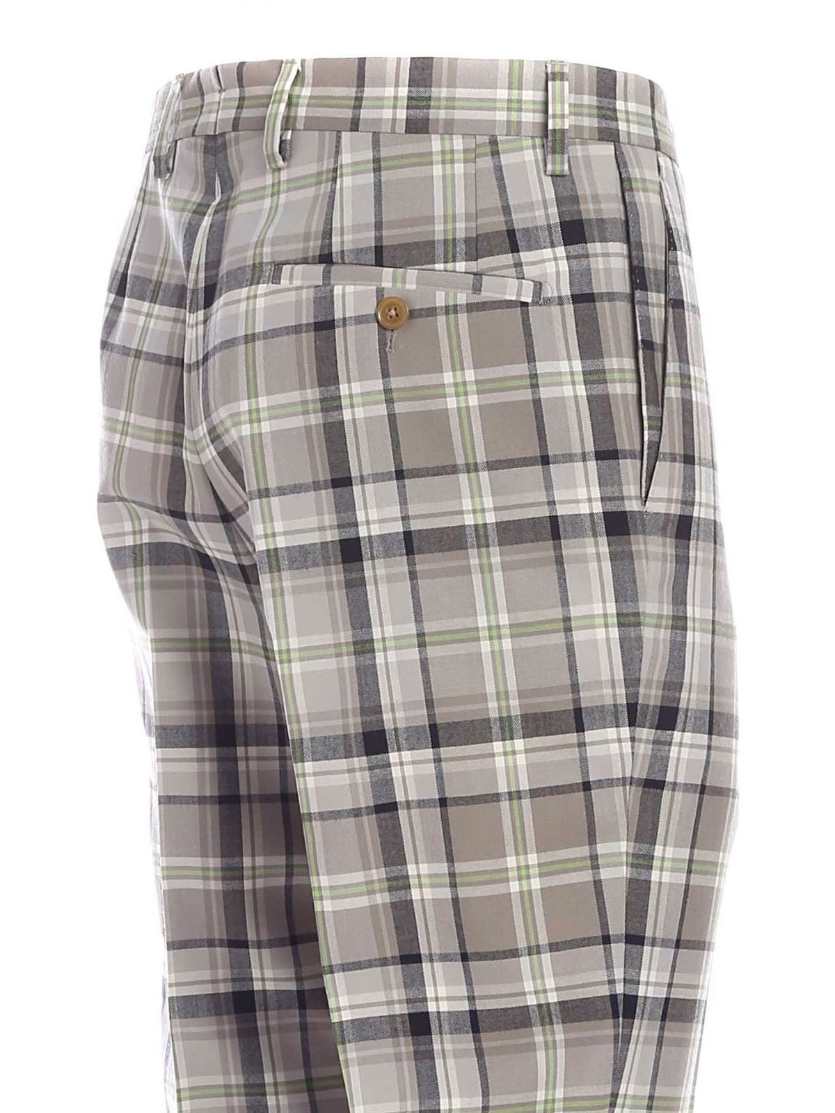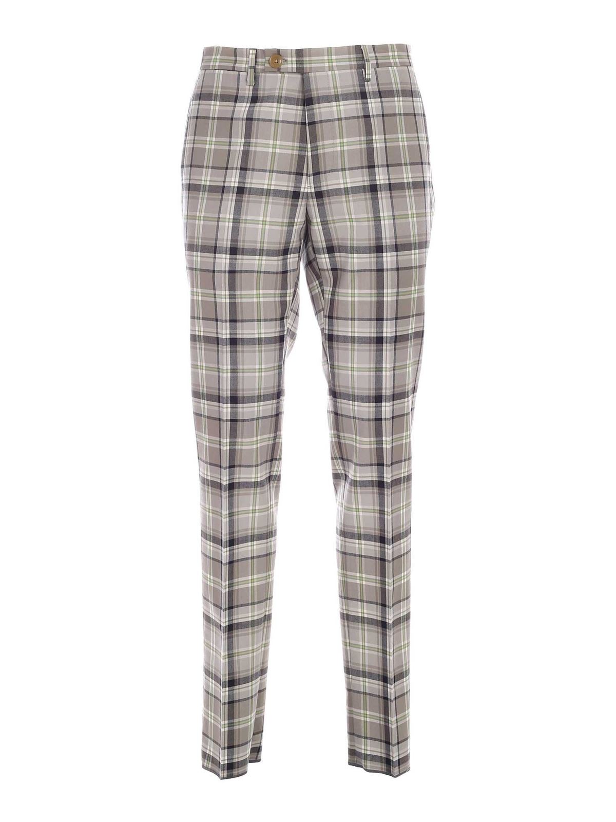 スリムウールパンツ 色:グレーの色合い ブラックとグリーンのチェック柄 サイドポケット 背面にボタン付きポケット アイロンをかけた折り目 ジップとボタン留め