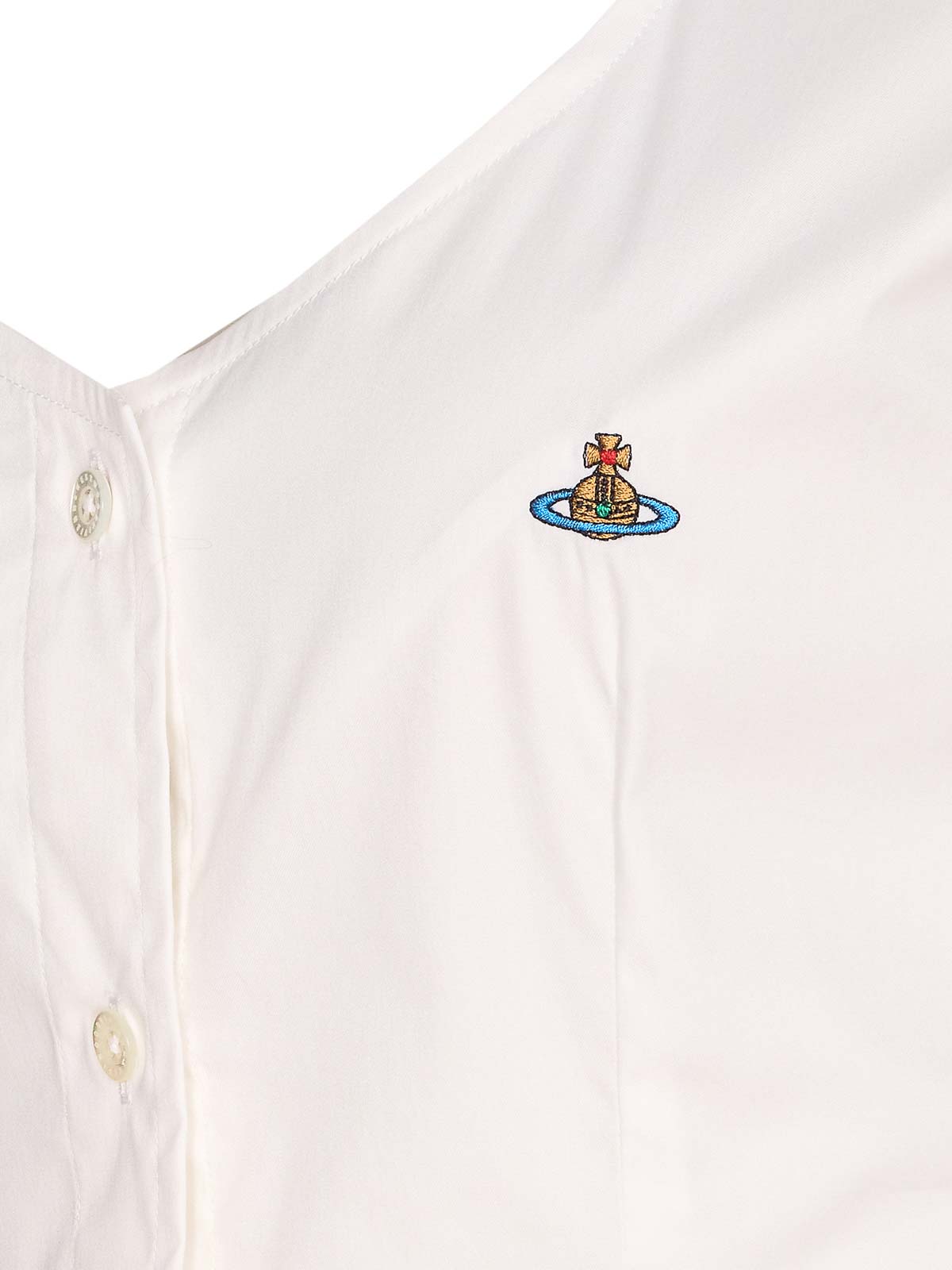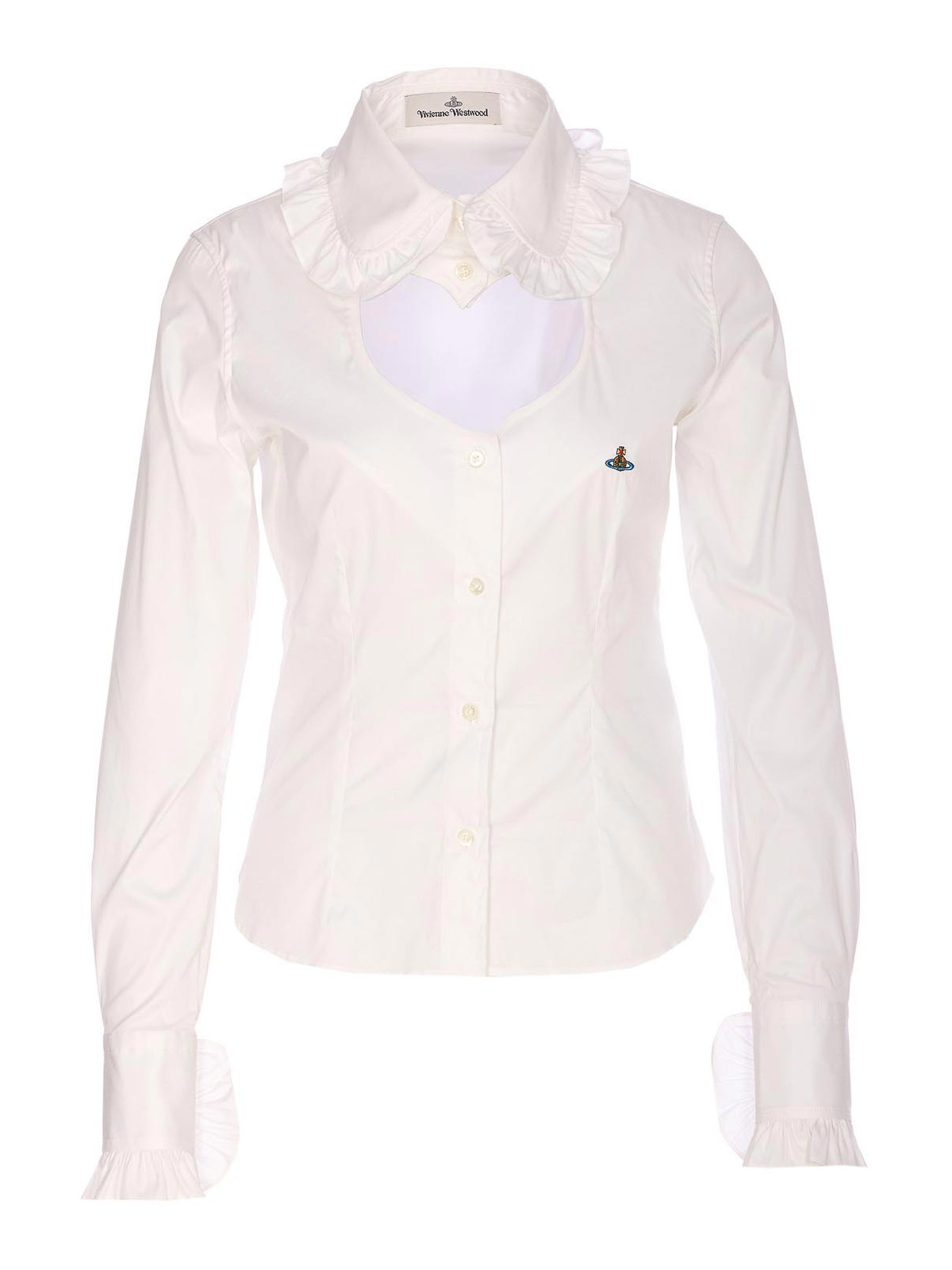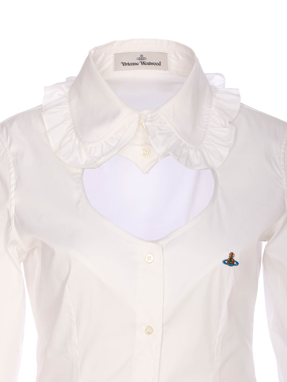 Vivienne Westwood ホワイトトゥールーズシャツ、フロントボタン留め、ロングスリーブ、ワイドネックライン、袖口にボタン、前面にオーブのロゴの刺繍、襟
